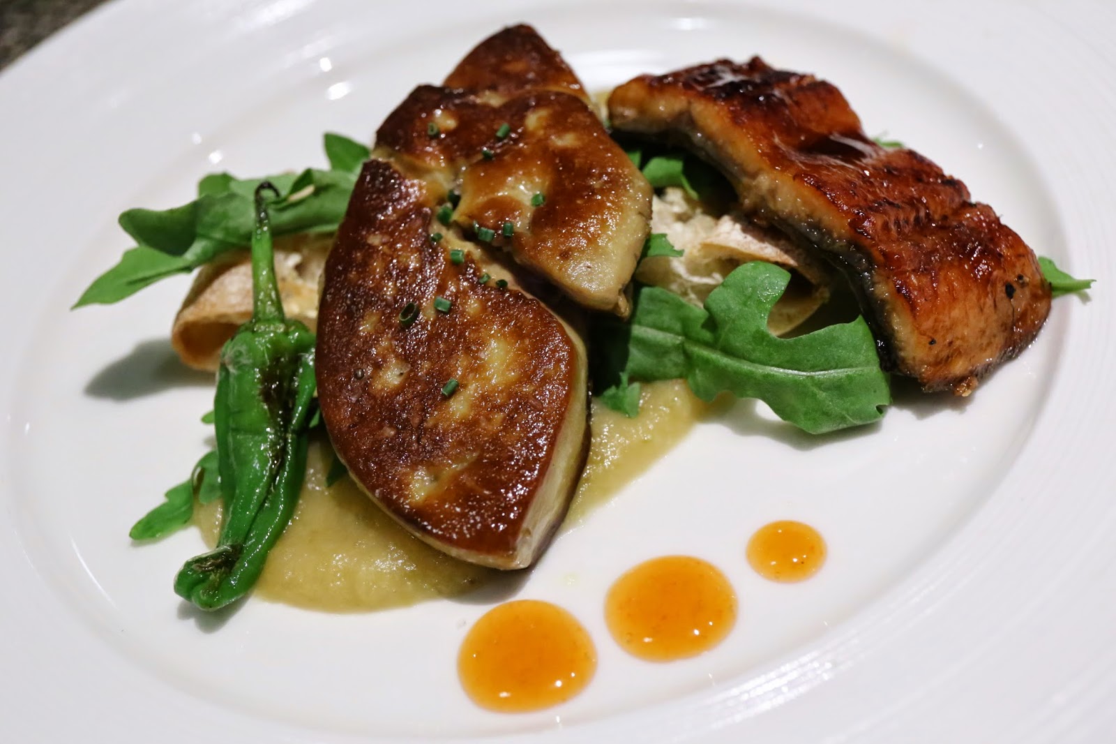 Foie gras and warm eel, apple puree, sweet chili sauce - Ninja and I both stared at the plate in front of us for a little while, having been left a little speechless. We were both thinking of numerous creations where chefs have combined layers of eel with layers of foie gras terrine, blending the flavors of the two ingredients and allowing them to compliment each other. But what we have here... was a piece of pan-fried foie gras, and a piece of grilled eel... Where we supposed to eat them separately, or together in the same bite? I wasn't sure, but I put both in the mouth together, and kinda found the flavors I was looking for.