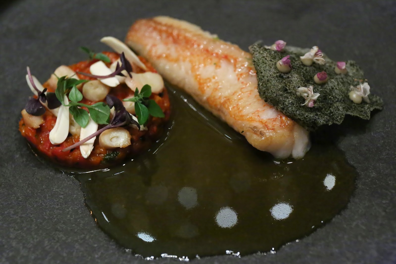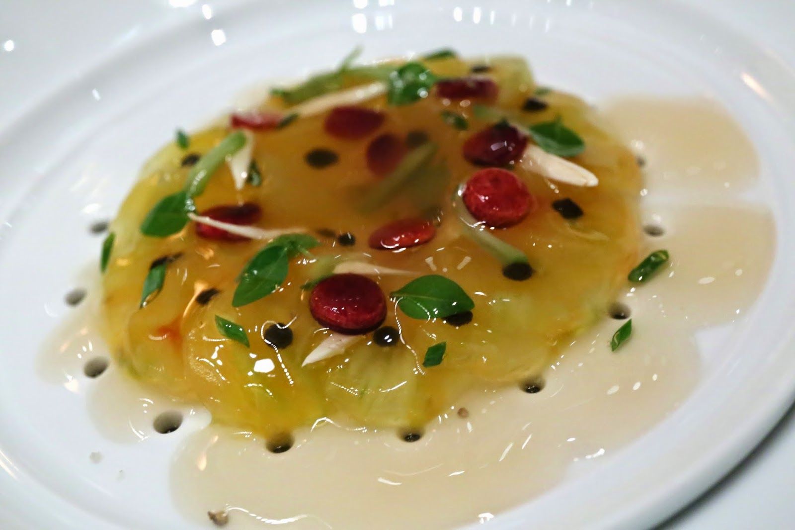 "Pineapple" tomato, fresh almonds, niçoise olive and summer truffle salad - I had the pleasure of tasting this dish last year, and it was just as yummy tonight. The peppers and basil were a lot more than just garnish. As for the tomatoes themselves... really really yummy. I think today's just a tomato day for me.