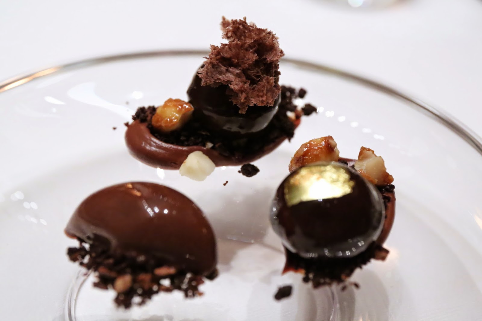 Dulcey chocolate spheres coated in Manjari 64% chocolate with salted and caramelized macadamia nuts and cocoa sorbet - loved the creamy milk chocolate centers inside dark Manjari. Served with chocolate sponge on one of the spheres, and chocolate soil.