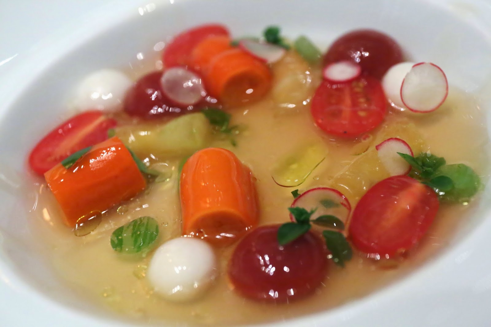 Clear gazpacho, stragiatella di buffalo - spheres of buffalo milk cheese, gazpacho, tomato hearts, cannelloni of tomato, Japanese Amelia tomatoes, cucumber and radish in a clear tomato gazpacho. Slurp.