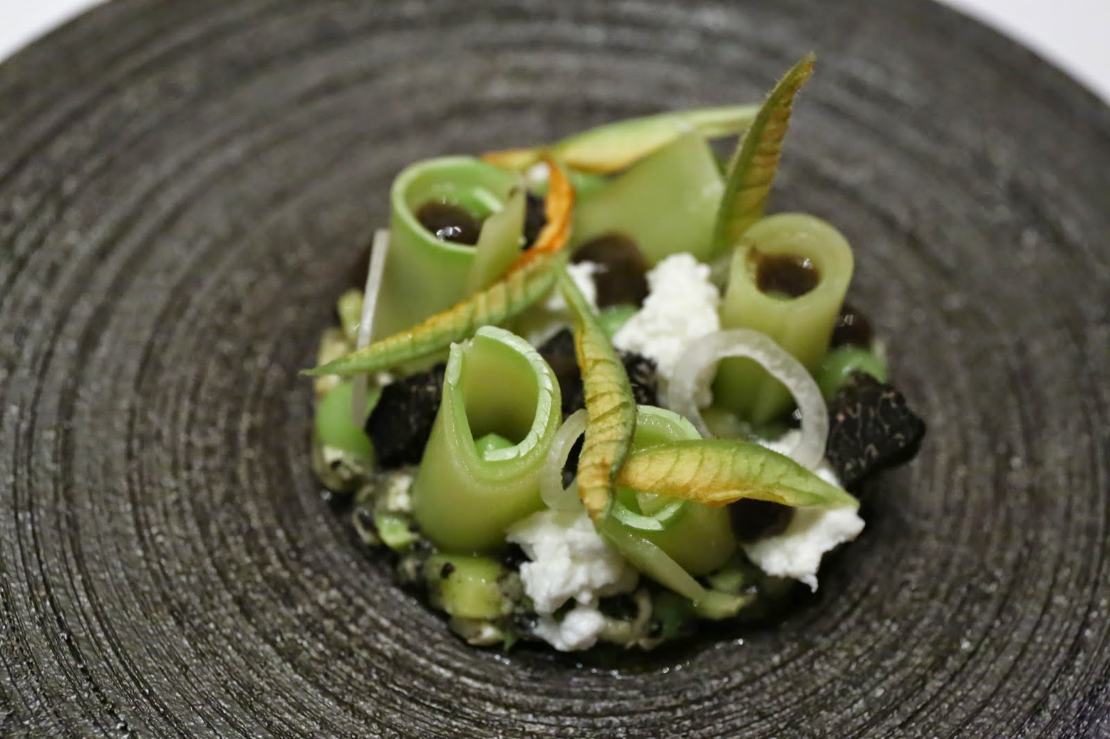 Violin zucchini, avocado, green olive and fresh almond tartar with black truffle gel and fragments - very nice with bûche de chevre from Corsina, black truffle gel inside the zucchini tubes, and chunks of black truffle.