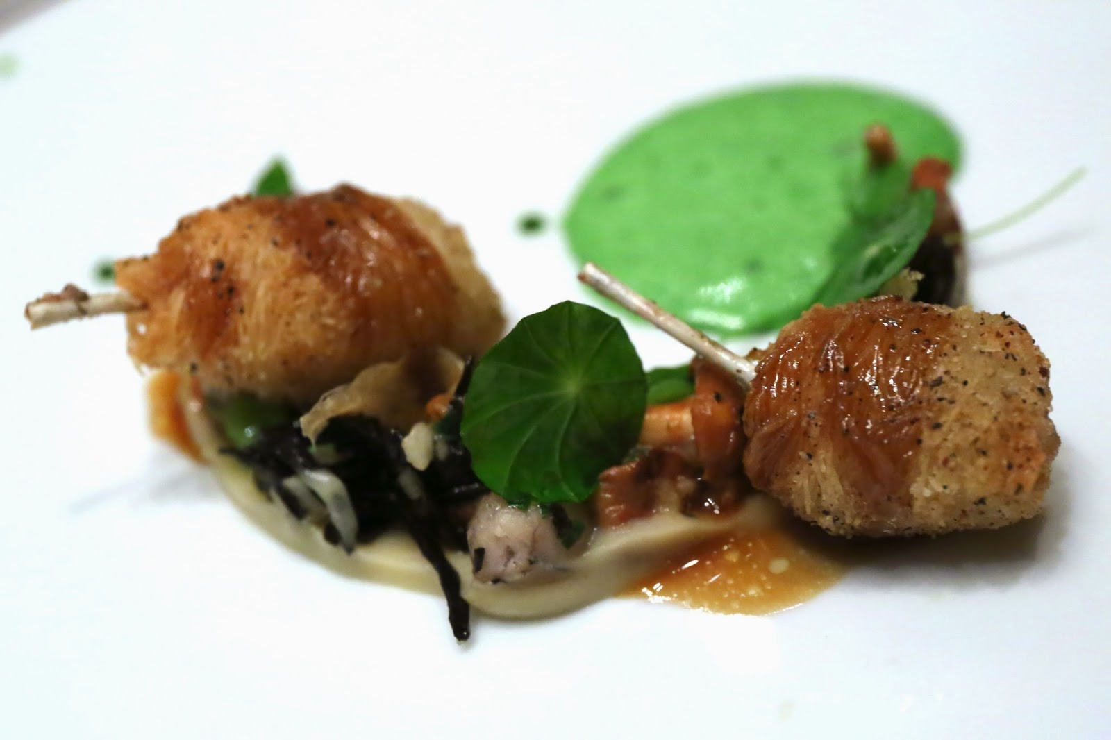 'Dombes' frog legs in crispy kataifi sprinkled with 'quatre epices' purée and chips of garlic, Italian parsley sabayon - this was so fun to eat! Frog legs from Dombes, coated with a layer of ground kataifi and deep-fried. Wonderful flavors from the spices and the chicken jus, and of course I had to roll these in the parsley emulsion. I just pinched the bones between my fingers, picked these up and shoved them into my mouth. The mixture of girolles, peas and some kind of stringy seaweed was really tasty, too.