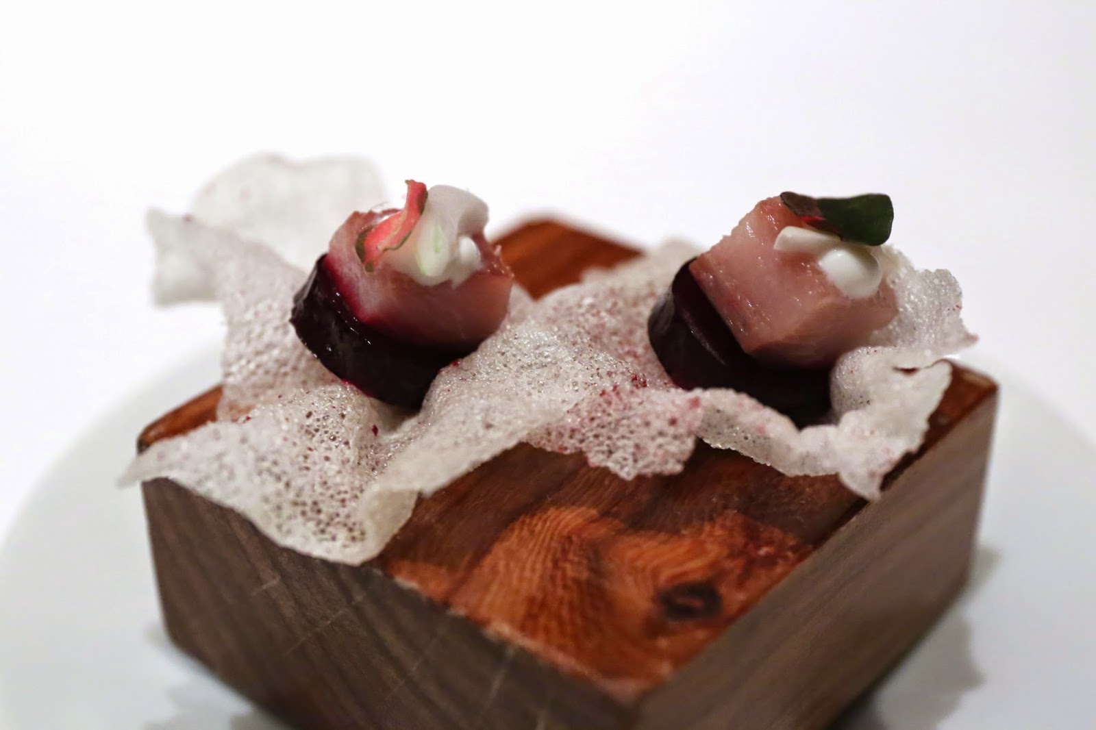 Foie gras lollipops - the kitchen was informed that one of us doesn't eat offal, so a cherry tomato was offered as a substitute. As for the rest of us... the mouthful of foie gras was as tasty as ever. And still love the beetroot.
