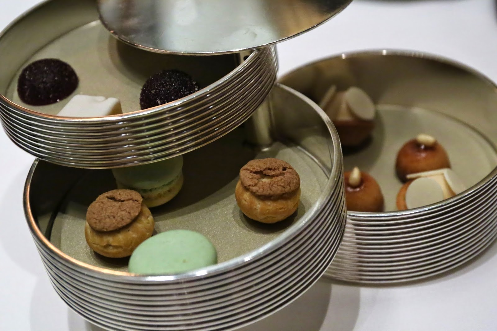 Petit fours - 6 different types, including cubes that were like orange blossom marzipan, raspberry jelly, hazelnut puff, (pistachio?) mint macaron, salted caramel and chocolate tart, and pine nut financier.