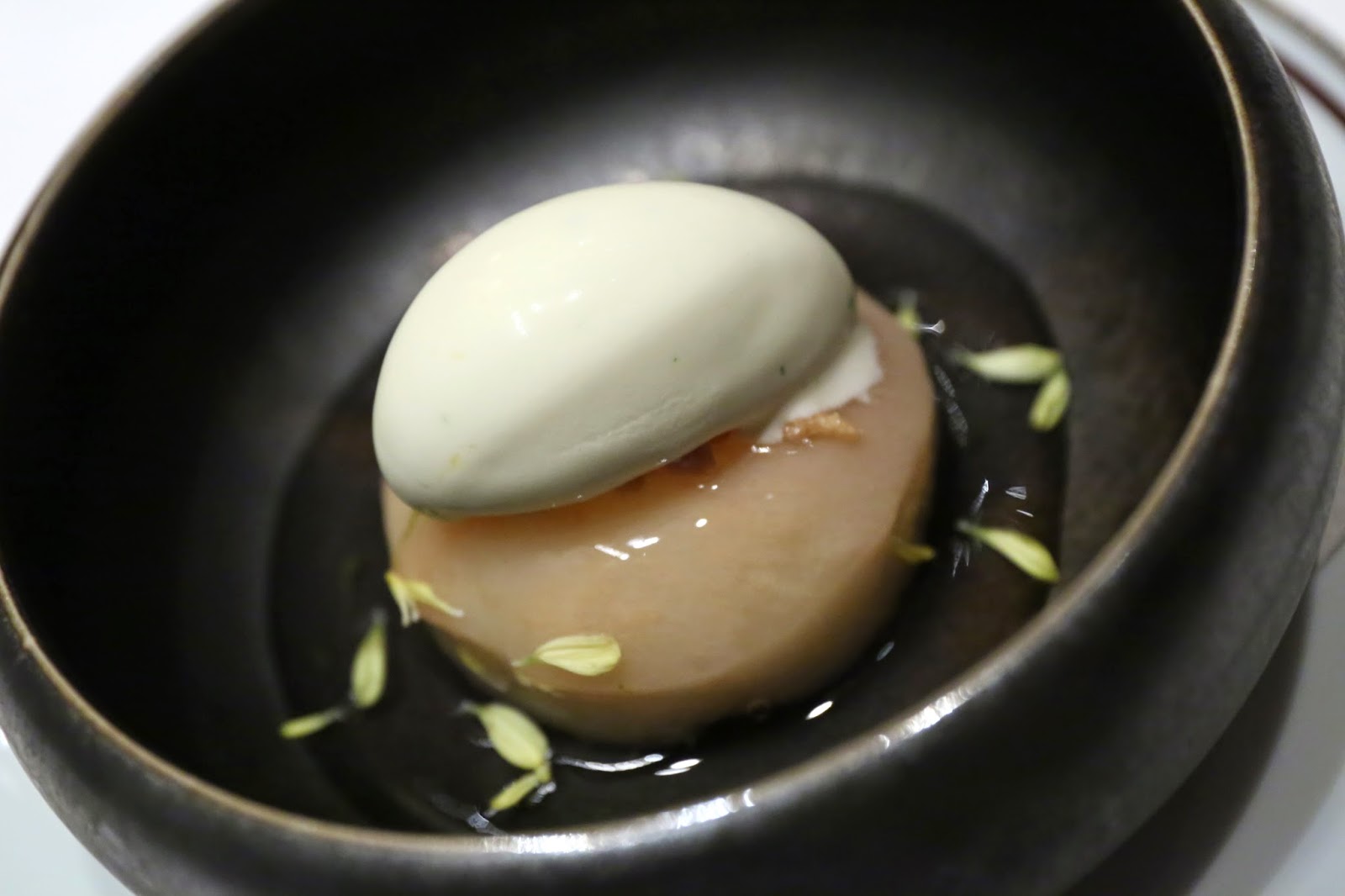 White peach poached in sake, citrus, nectarine cream marigold petals, sake lees ice cream and rice crispy - sooooo yummy. So this was triple-sake: peach, ice cream and jelly. Incredibly refreshing.