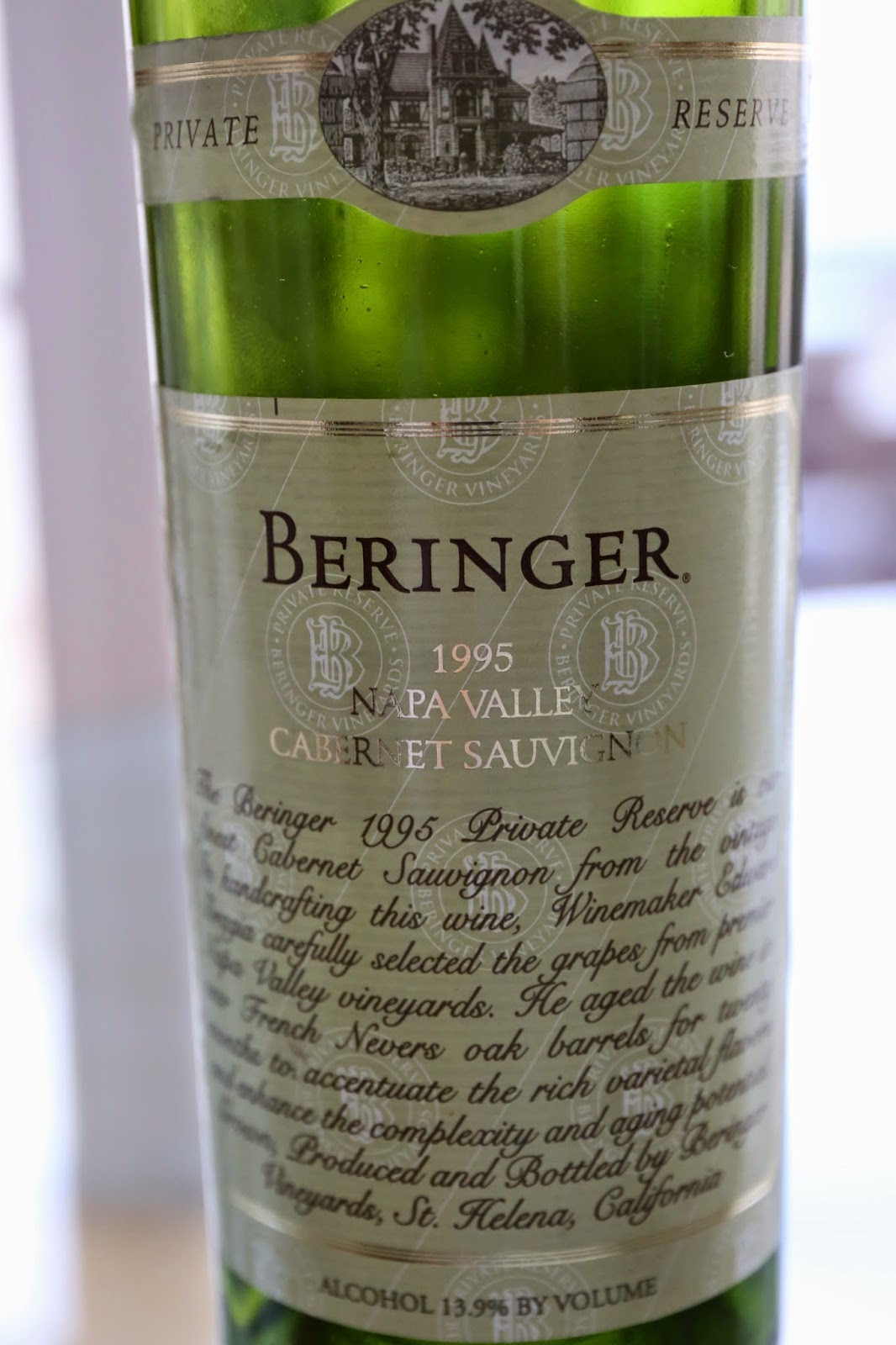 1995 Beringer Cabernet Sauvignon Private Reserve - very fragrant and cedary nose, sweet on the palate, and very full-bodied with some tannins left. Drinking nicely.