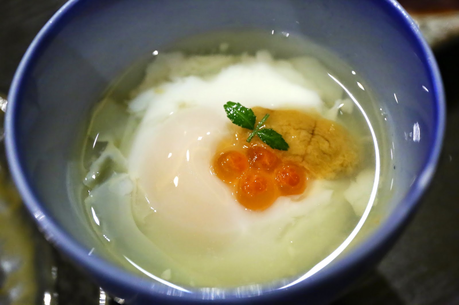 Onsen egg with sea urchin and salmon roe (温泉卵、雲丹、イクラ) - pretty nice, but the surprise was the little sansho leaf (木の芽) which gave the whole thing the slightest of kicks and made it much more interesting.