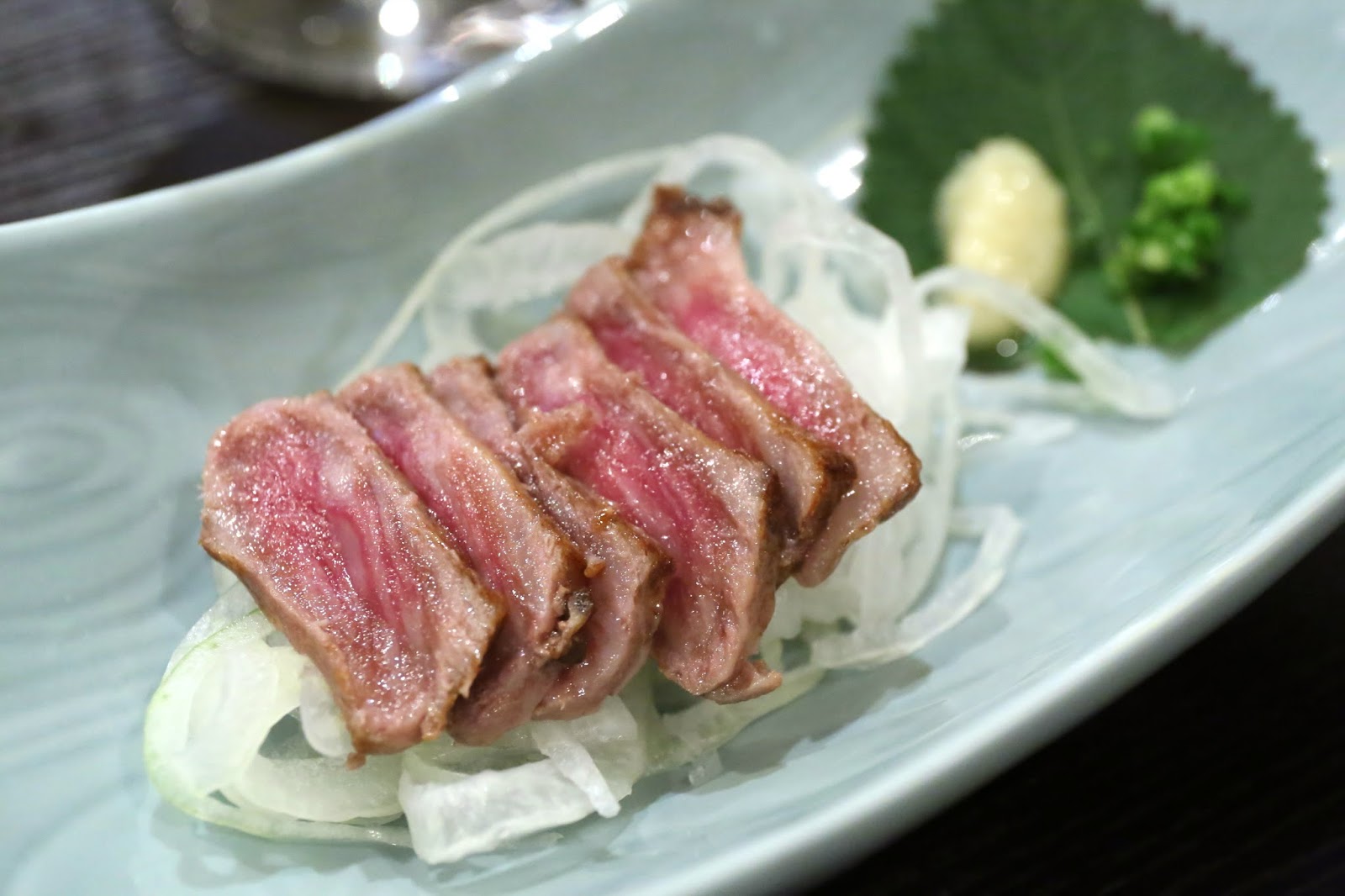Wagyu tataki (和牛たたき) - finally, the dish that should have been served much earlier. Thin slices of Kagoshima (鹿児島) beef, ever-so-slighly seared. Very, very tender and well-marbled.
