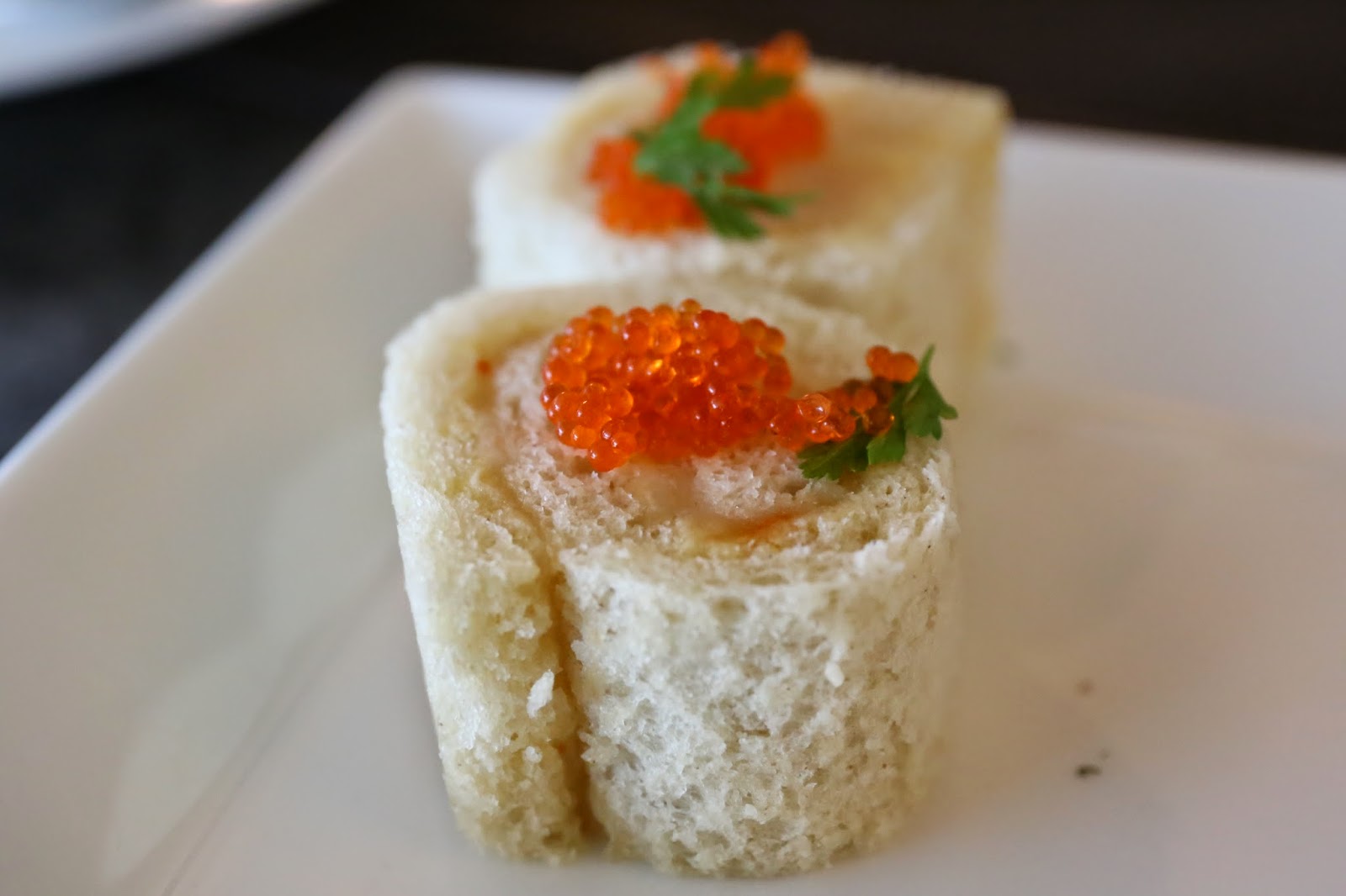 Seafood mousse citron bread Swiss roll with crab roe - very interesting. The seafood mousse inside tasted kinda sweet, and juxtaposed with the savory flavors from the crab roe on top.
