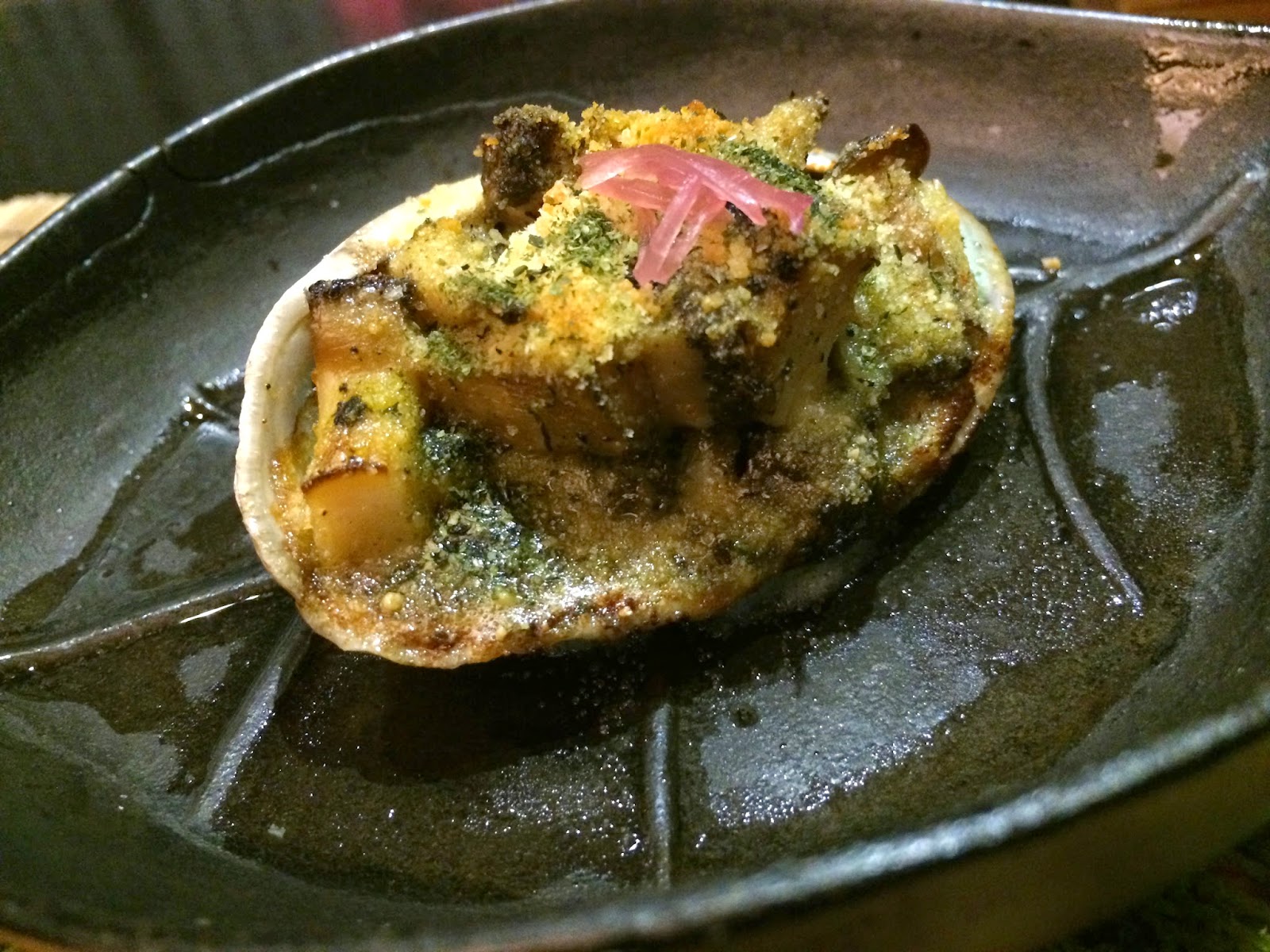 Cheese and seaweed powder was sprinkled on top, and shimeji (しめじ) mushrooms were mixed in among the slices of abalone, with pickled myoga on top. Interesting that they also had the liver here. The abalone was pretty good, but unfortunately I didn't care for the cheese powder they used... tasted cheap and crappy.