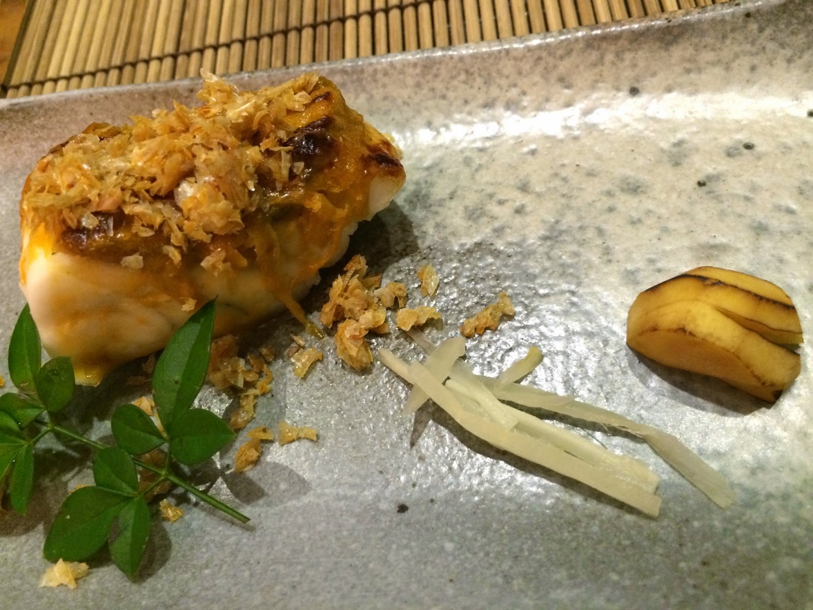 The red sea bream was coated with sea urchin and chrysanthemum. Served with pickled ginger strands and roasted chestnuts on the side, and sprinkled with deep-fried scales from the sea bream. Very yum. Using sea urchin as a "spread" was certainly interesting, but the real killer was the fish scales...
