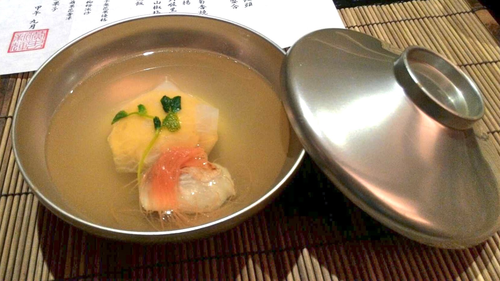 Pumpkin and red sea bream dumpling and grilled sea bass (椀物 南瓜しんじょと鱸塩焼き) - the pumpkin and red sea bream dumpling was very soft, fluffy and yummy. Covered with a very thin sheet of radish, a sprinkle of very young pea shoots and a small piece of yuzu (柚子) rind for fragrance. The grilled sea bass had thin strands of carrots on top. All in a light broth made with dashi (出汁).