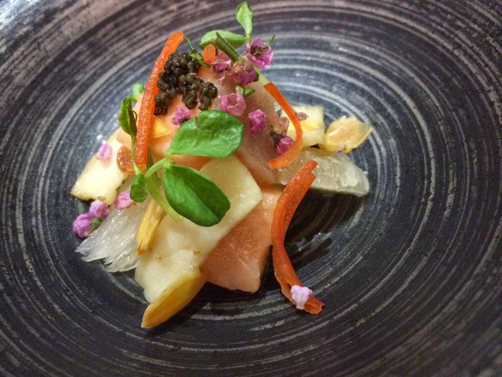 Salmon and pomelo salad (旬肴 秋鮭と文旦のサラダ仕立て) - with pea shoots, perilla flowers, red capsicum, king oyster mushrooms, toasted almond slices and a little bit of caviar on top.