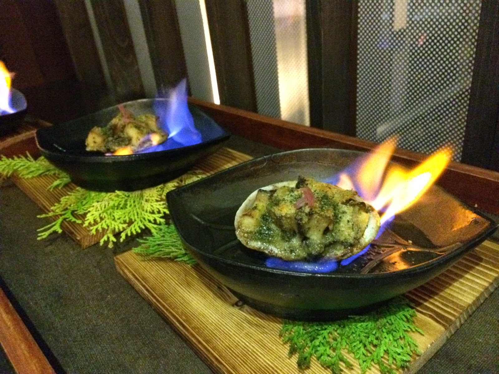 Grilled abalone with cheese (進肴 鮑黄身チーズ焼き) - this was lit and finished within our view.