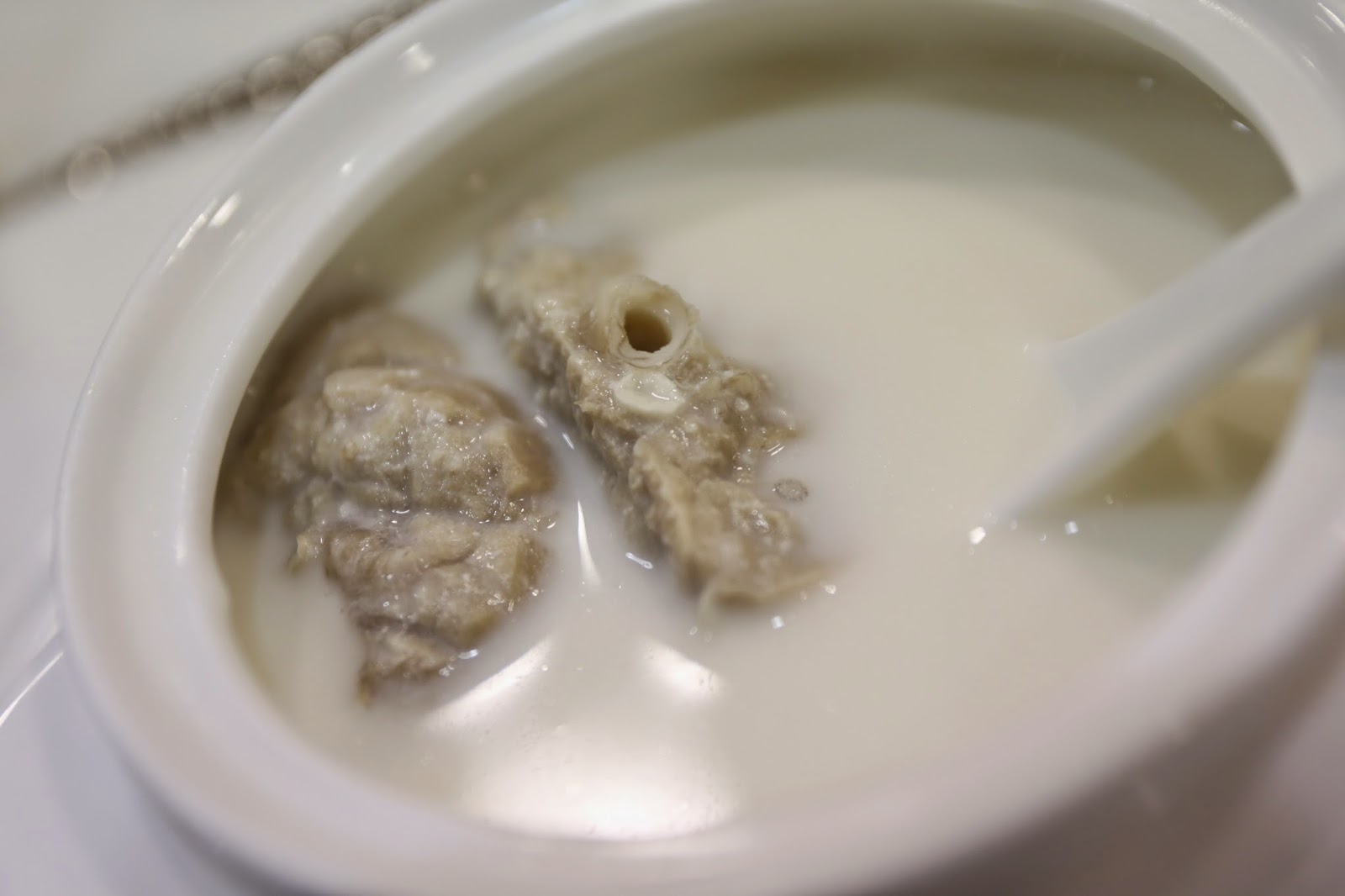 Double-boiled almond soup with pig lungs (生磨杏汁燉白肺湯) - definitely something you can't find in Taipei. First of all, I don't think anyone makes anything savory with apricot kernels in Taiwan... and I doubt that many people cook with and eat pig's lungs. In any case, I thought the soup was nicely done here... with a rich and slightly thick texture and plenty of fragrance. The kiddies seemed to like it, too... and even ate the pieces of lung.