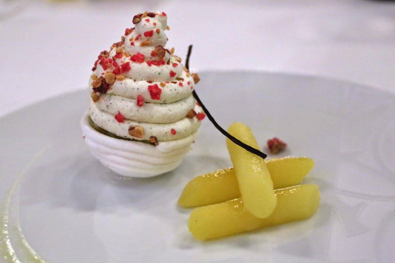Pineapple pavlova, lime, ginger and crispy meringue - actually pretty nice combination of flavors and texture. Served with local pineapple hearts on the side, which naturally provided crunchy texture but were relatively bland in flavor.