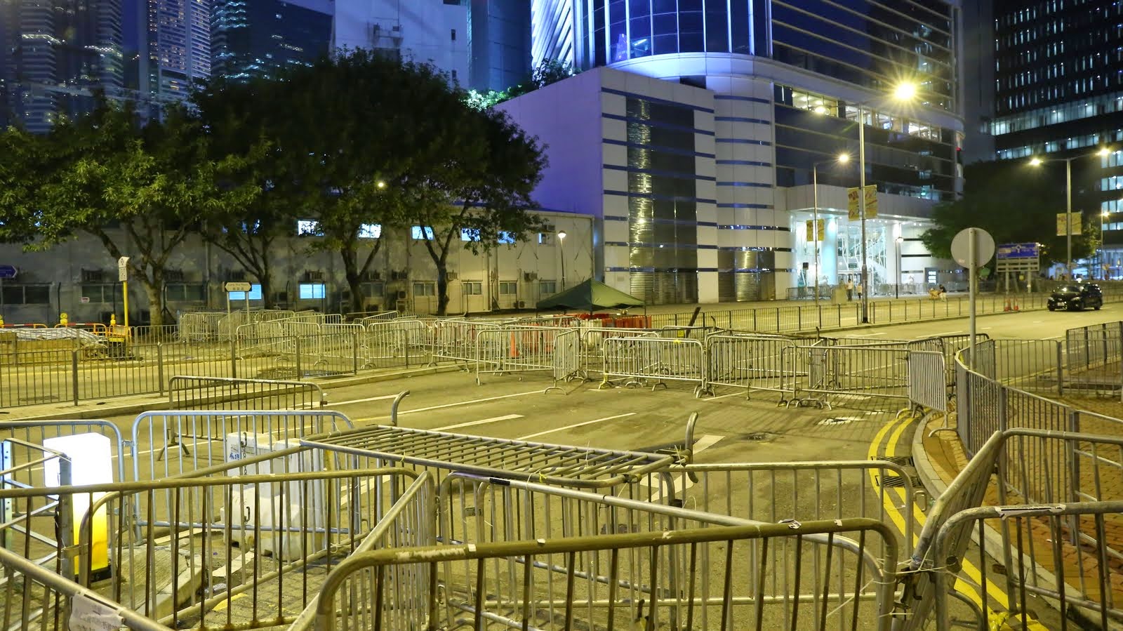 I started seeing road barriers around the intersection of Lung Wui Road (龍匯道) and Fenwick Pier Street (分域碼頭街). Surprisingly I saw no police officers there - just an empty stretch of road leading past Citic Tower towards the roundabout in front of the collection of government buildings.