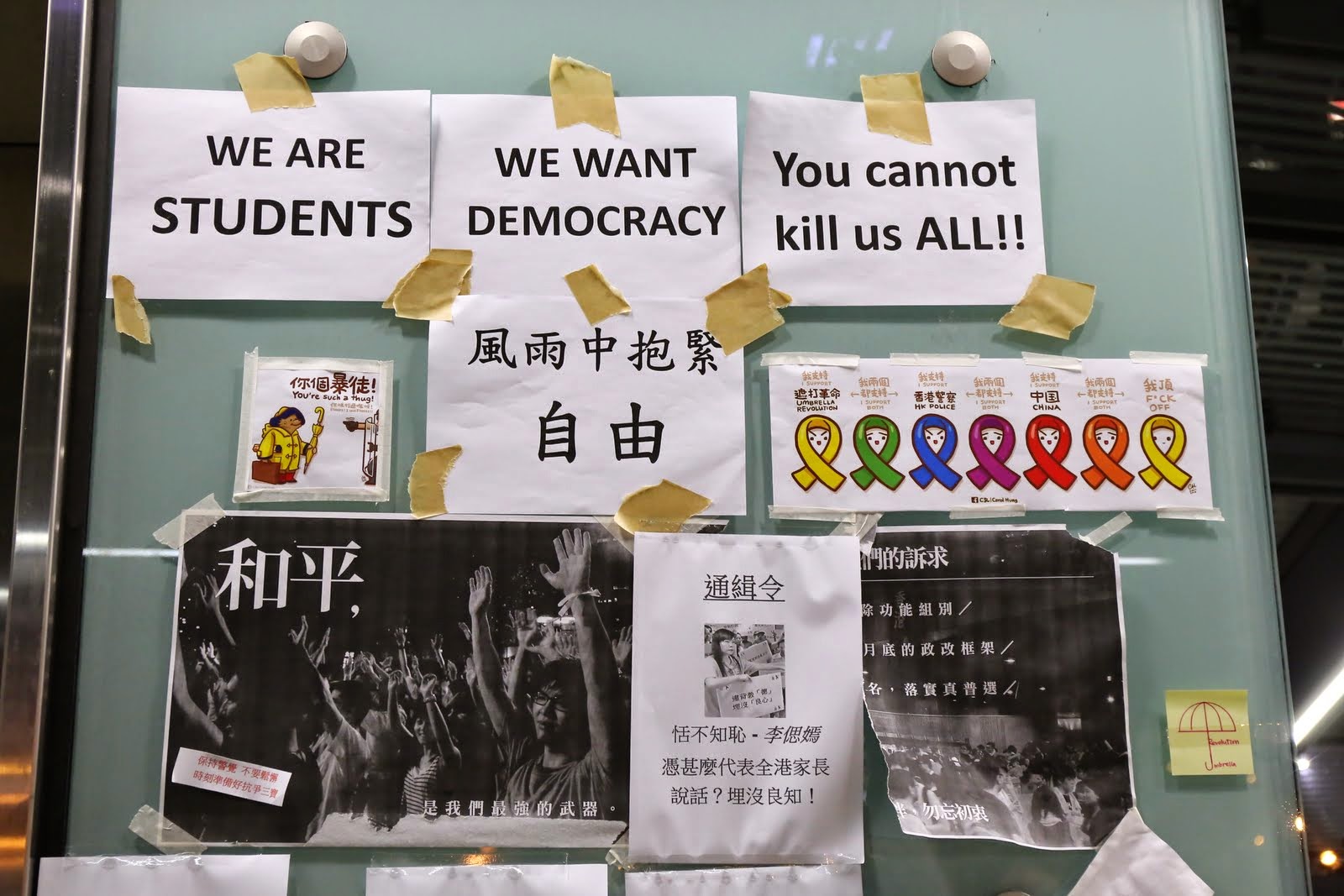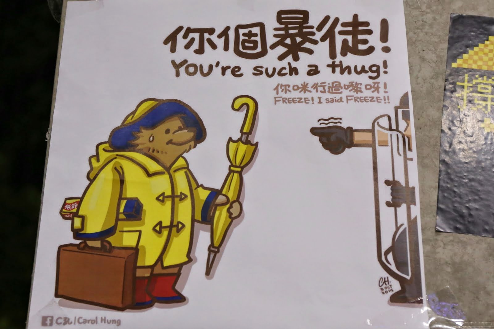 Even poor Paddington Bear was accused of being a violent thug (presumably by the police)... since he was carrying an umbrella in the color that has come to symbolize the student movement, and also a roll of cling wrap - dangerous offensive weapons indeed.