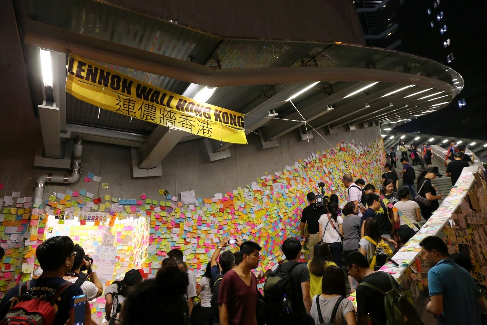 There are literally thousands of little Post-its and other pieces of paper stuck here. Pads of Post-its are left on a stand here, and anyone can pick one up and leave their own very personal messages. Taking a few steps back and getting the full view of this "installation" is quite a sight to behold. Believe it or not, similar messages are not just left here, but stuck on walls of barricades left in the middle of Tim Mei Avenue (添美道). These have been covered in plastic to shield them from the rain that has hit Hong Kong sporadically over the last week.