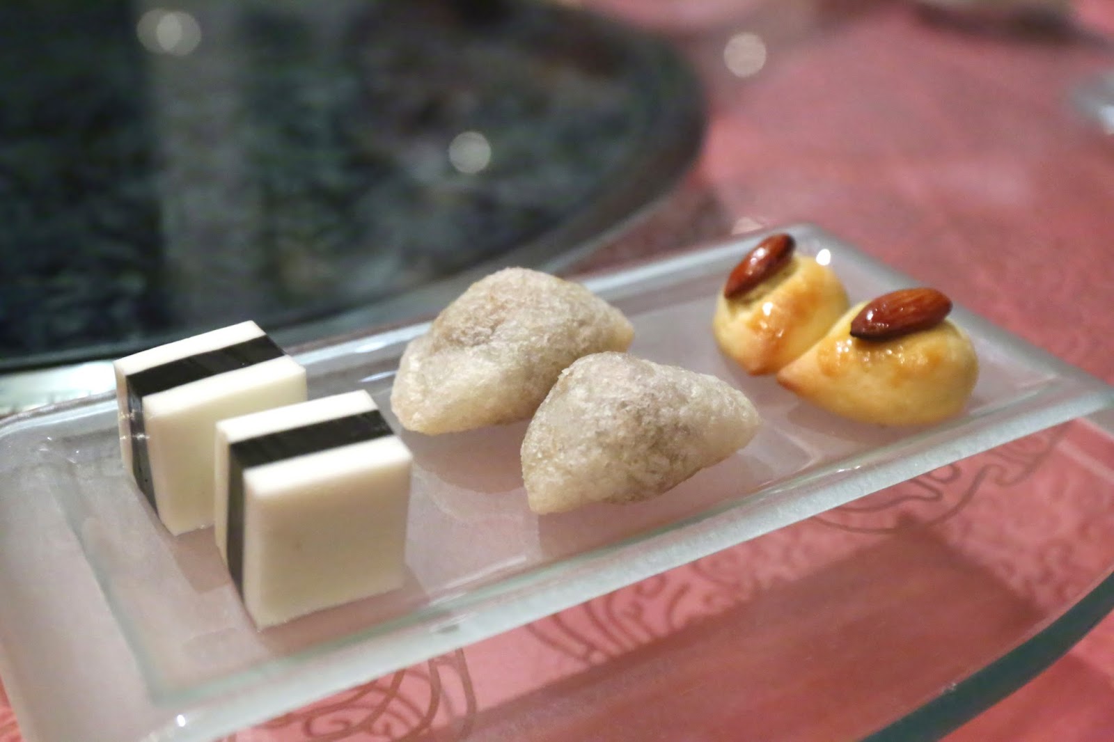 The petit fours consisted of coconut and black sesame jelly (椰汁芝麻糕), almond tarts and a deep-fried dumpling filled with red bean paste that surprised us by being spicy.