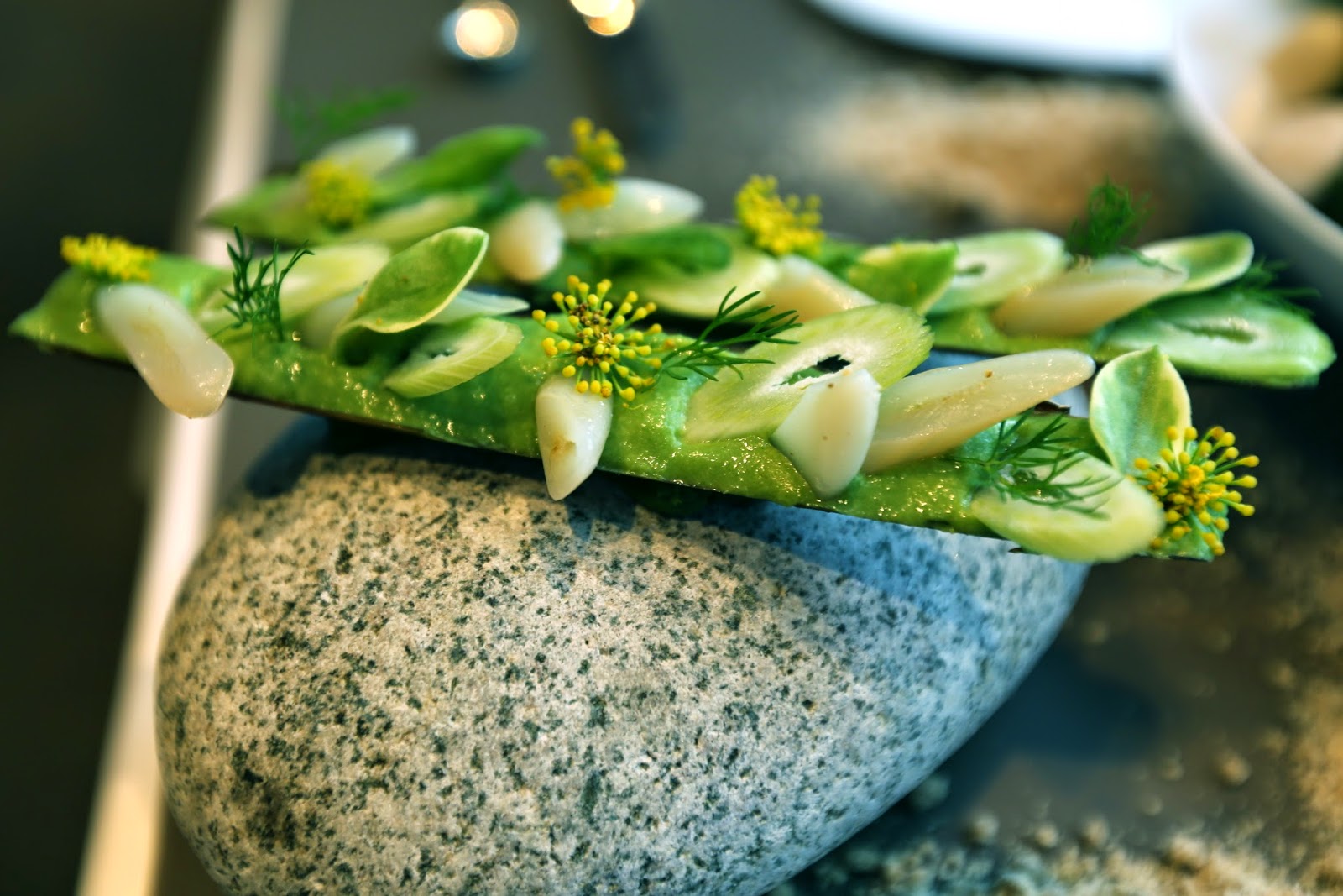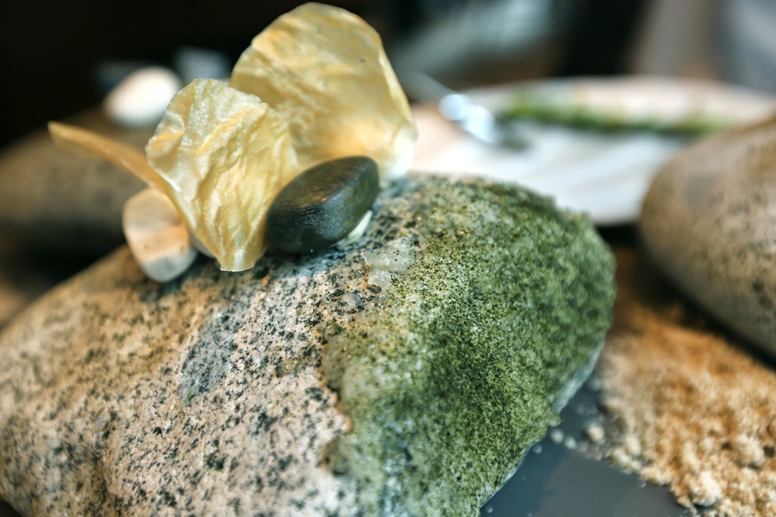 First Uwe came and sprinkled a bunch of fermented beer soil around. Then the staff came over and laid down a bowl containing pebbles and seaweed, and liquid was poured into the bowl so that the dry ice could release the scent of the sea. This was by now a familiar sight, and Uwe said he works with someone in Spain for the scent - which makes sense considering Azurmendi has a presentation like this. Then someone brought a big rock and set it in the middle of the bowl, and the staff proceeded to bring out more rocks, progressively - each bearing a different type of seafood on top.