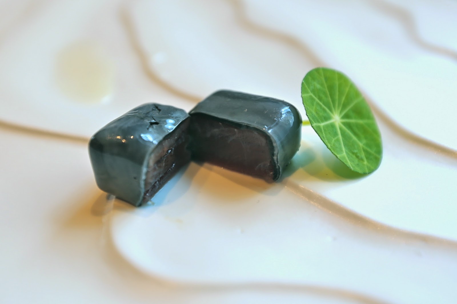 It turns out these were blocks of tuna, wrapped in layers of gelatin. The gelatin was made with capers and gherkins, which provided the acidity to balance out the flavors from the tuna. When I ate the gelatin together with the tuna, I had real trouble distinguishing any flavors from the gelatin. It was only when I deliberately separate the gelatin and tasted it on its own that the acidity really came through. Pretty interesting...