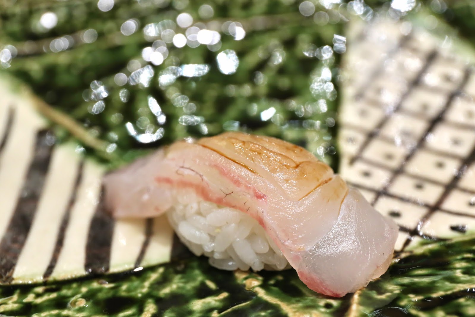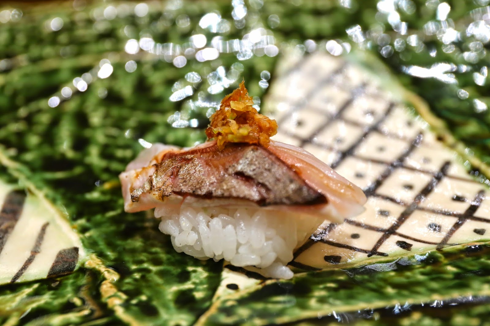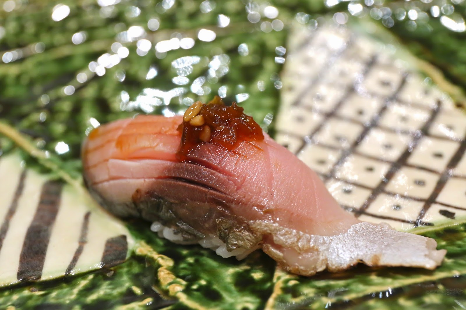 Striped jack (縞鰺) - the chef offered two pieces of nigiri as replacement for the fatty tuna and scallion roll I turned down. This was the first one. Served with the same relish as the salmon.