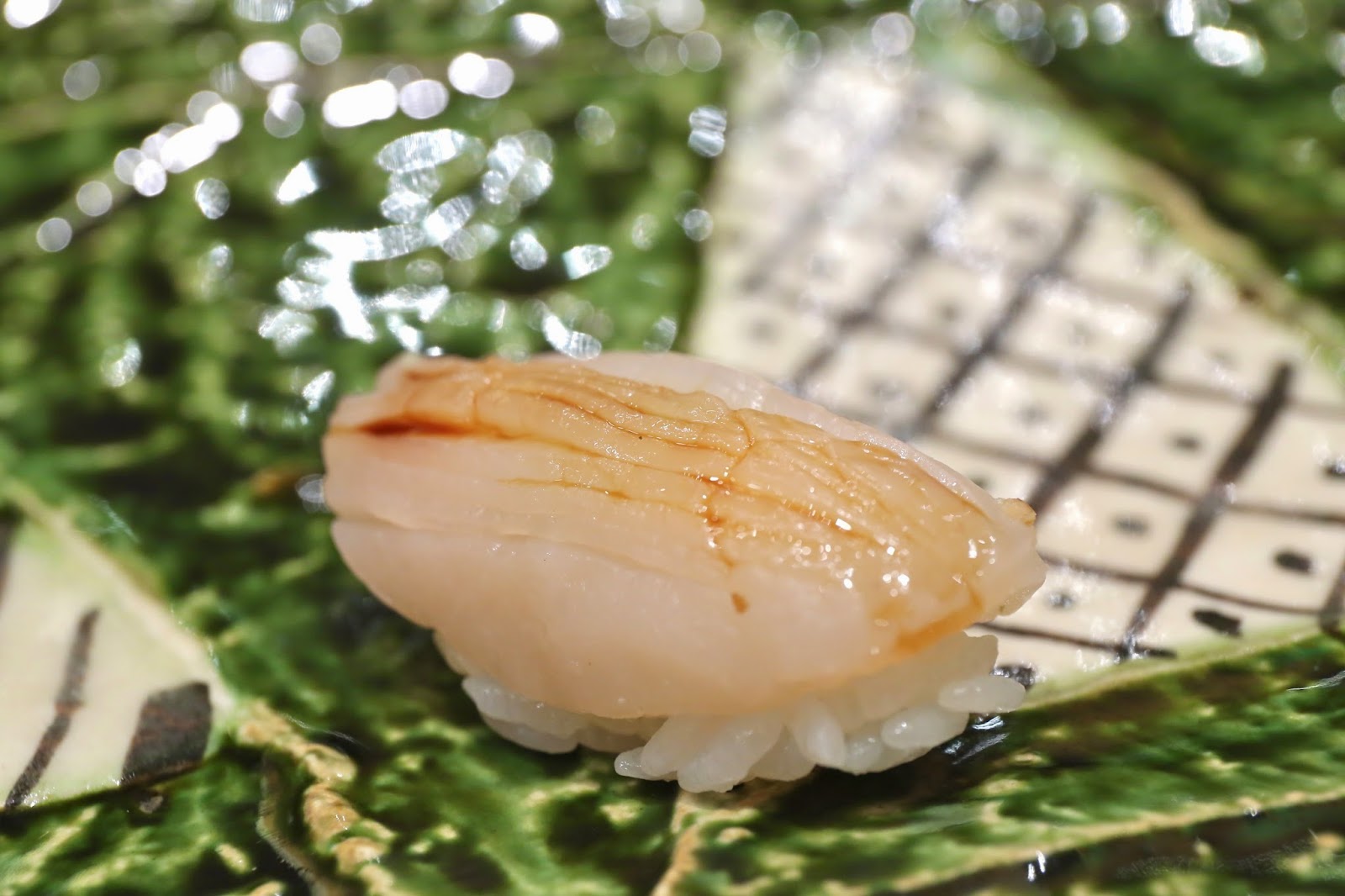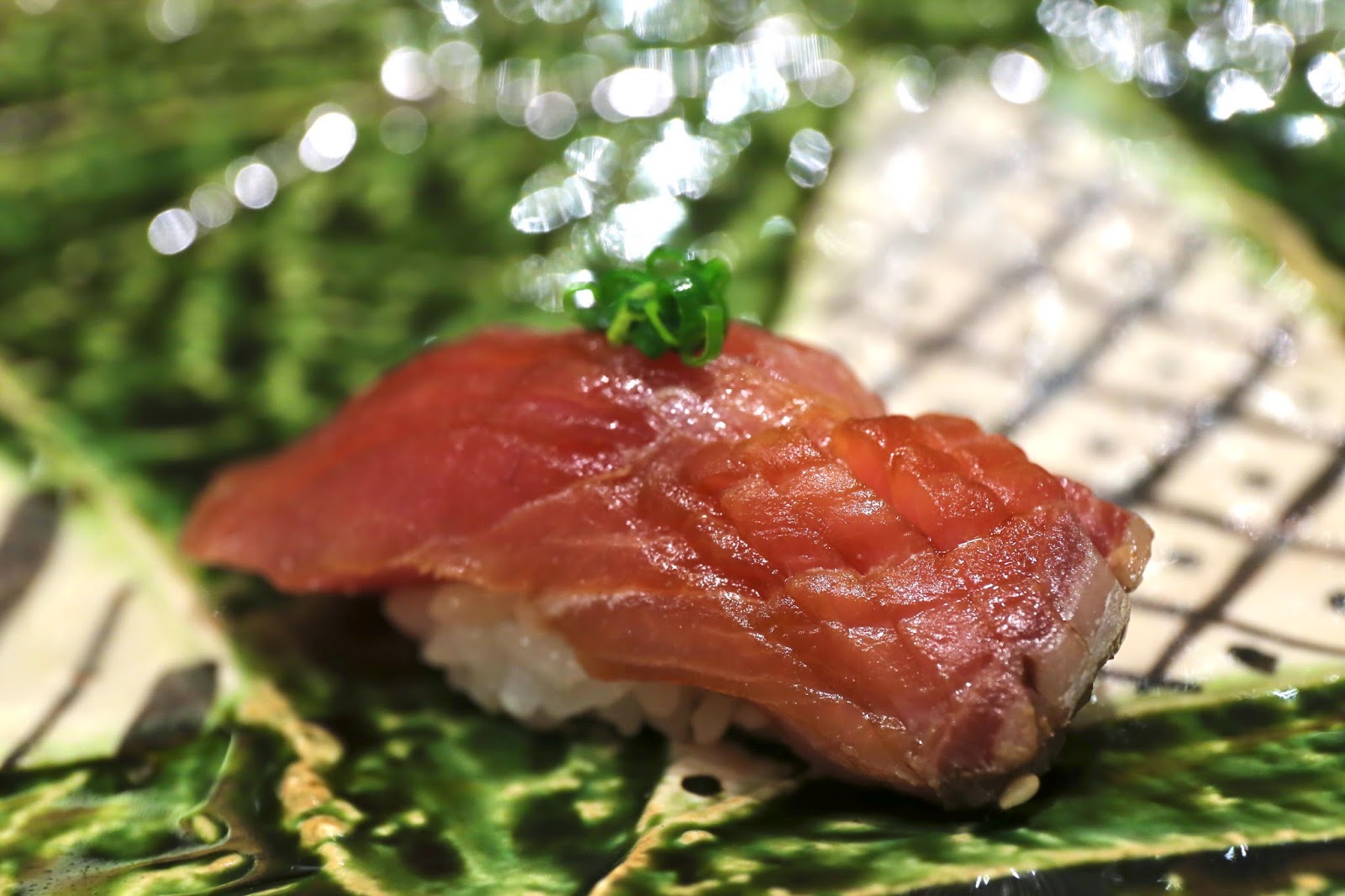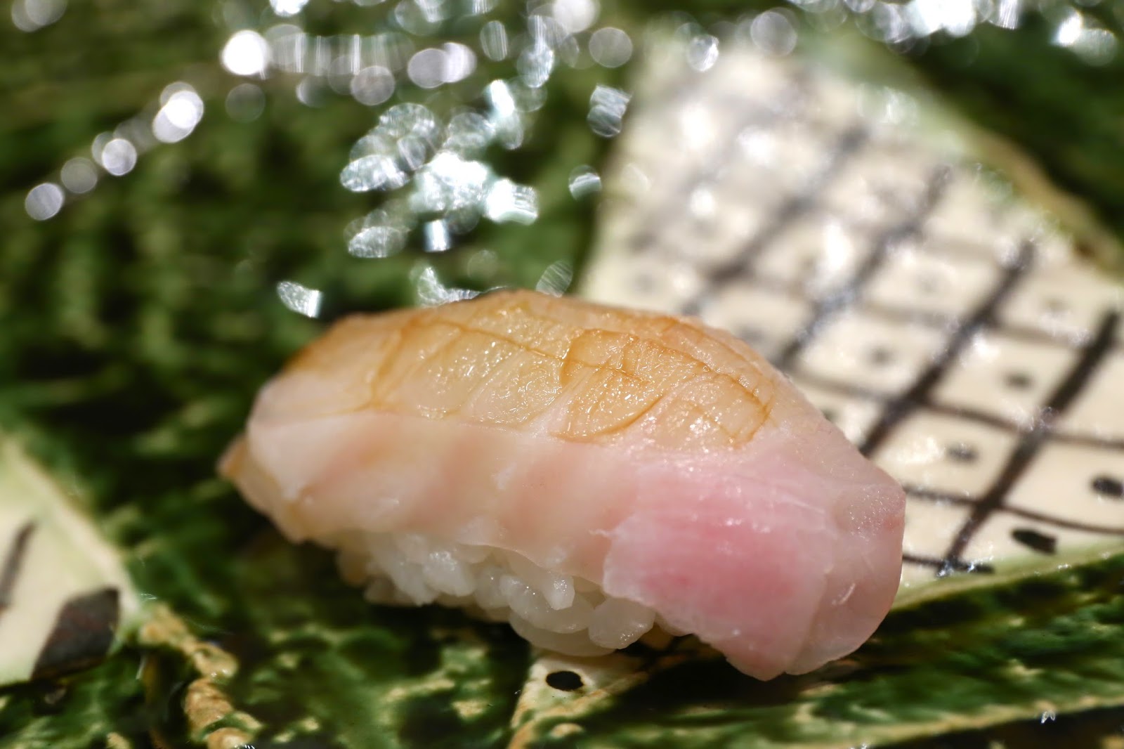 Striped jack (縞鰺) - the chef offered two pieces of nigiri as replacement for the fatty tuna and scallion roll I turned down. This was the first one. Served with the same relish as the salmon.