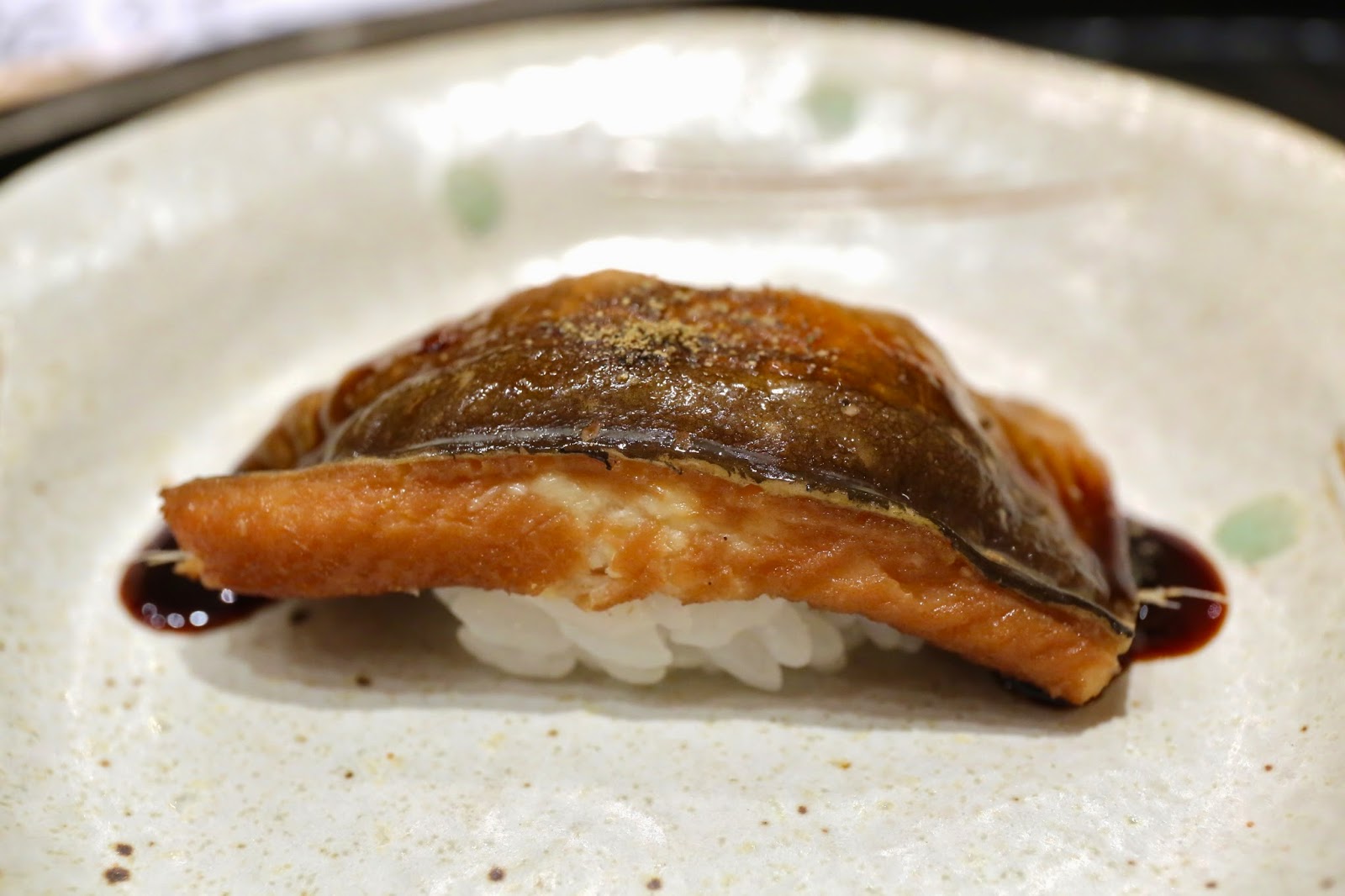 Yellowtail (鰤) - wild. Marinated in soy sauce, scored and lightly torched on the skin side. Very, very yummy.