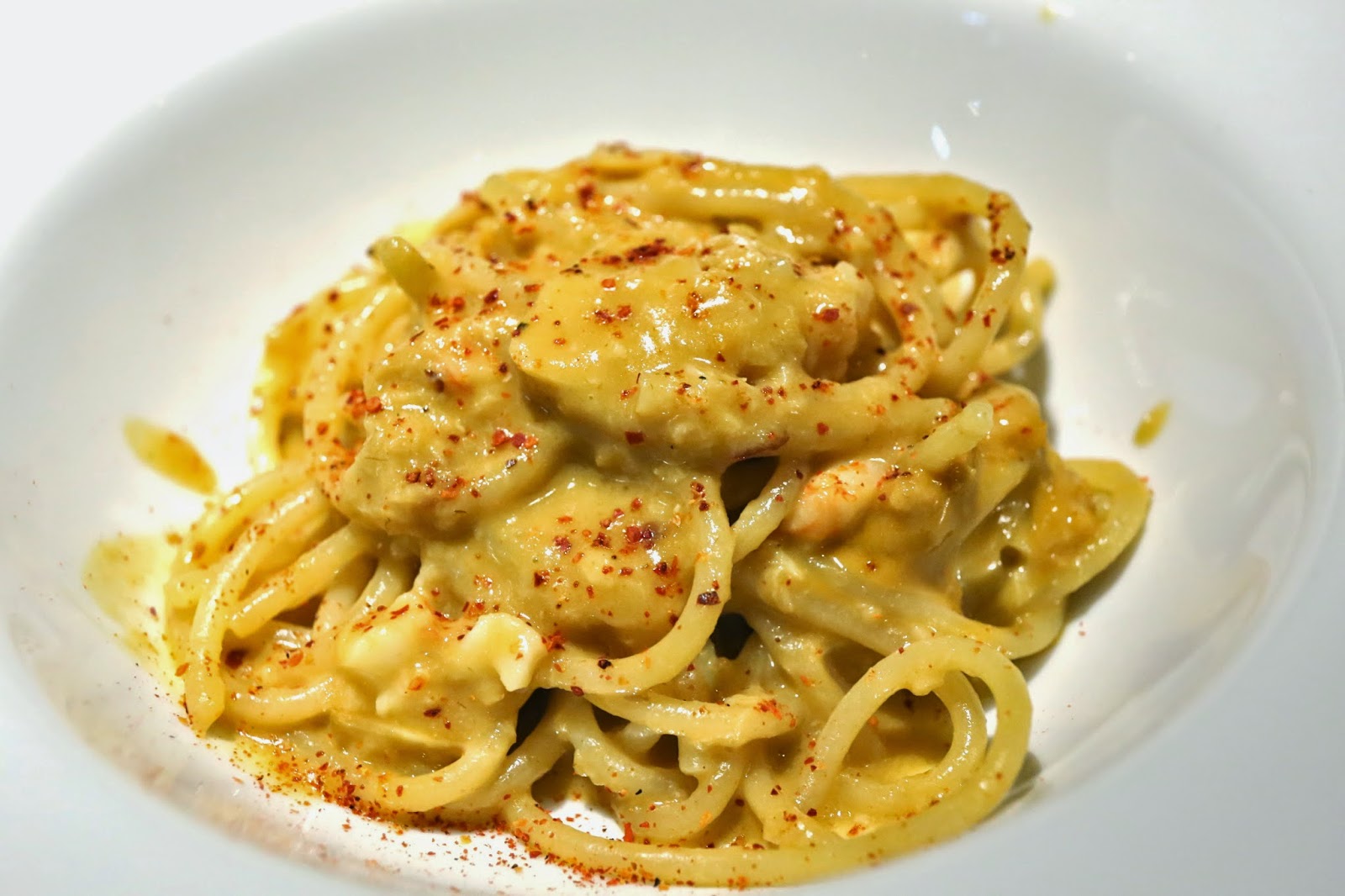 If the sauce tasted incredibly familiar, it was because that was basically David's bouillabaisse. He takes his bouillabaisse, removes the fish and mashes it up, and then puts the paste back in - thereby creating the viscosity. Add some shrimp, sea urchin and sprinkle with lots of piment d'espelette powder... Voila! Incroyable!