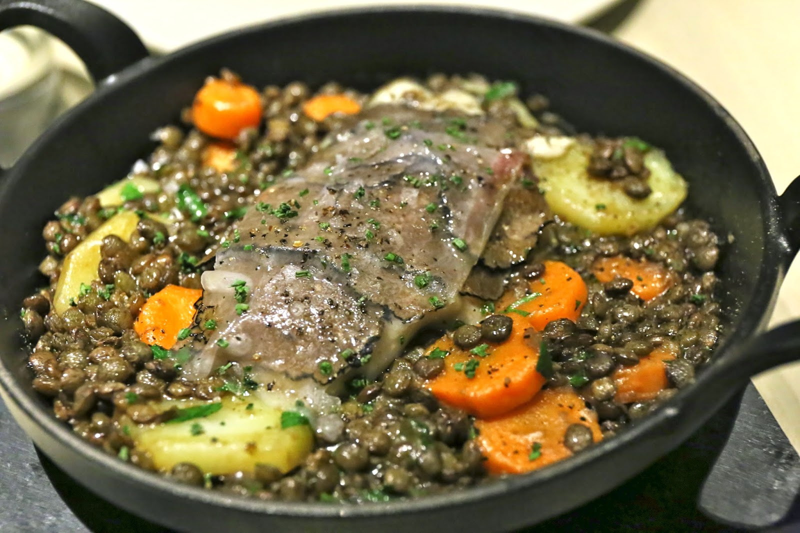 We were more than happy to pause here for a while and move on to dessert, but David had other ideas. He sent out the dish that put me over the edge... which was baked oyster / autumn truffle / lardo. The oyster really wasn't small... and it was covered with a sheet of lardo. The whole thing sat on a bed of Puy lentils, with chunks of potato, carrots, and slices of autumn truffle.