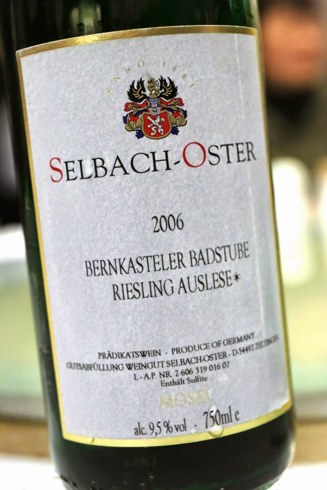 2006 Selbach-Oster Bernkasteler Badstube Riesling Auslese* - a little plastic, honey, orange blossom water. Very sweet, and probably more suited as a dessert wine.