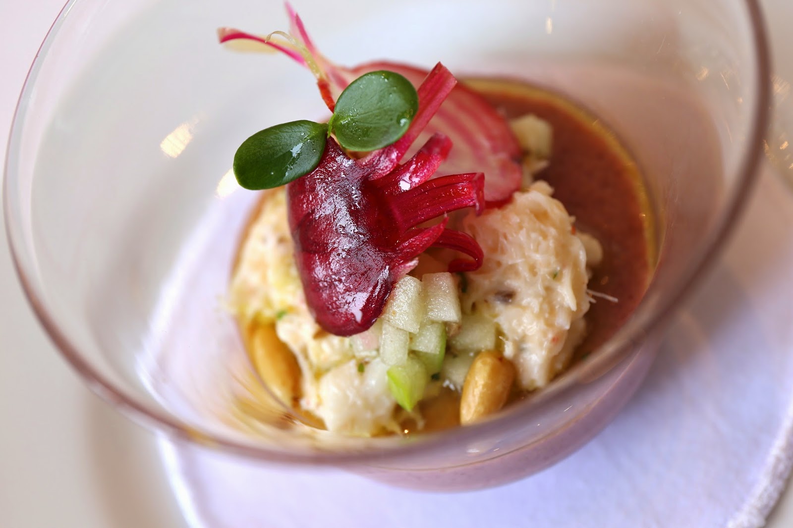 Our first amuse bouche came quickly. Beetroot custard, with some Chilean sea bass, mayonnaise (and truffle?), along with diced Granny Smith apple, pine nuts, and topped with slices of beetroot. Pretty interesting melange of flavors and textures here. The richness of the mayo was countered by the acidity of the apple, and the earthy flavors of beetroot balanced out by the ocean flavors from the sea bass. So far, so good...