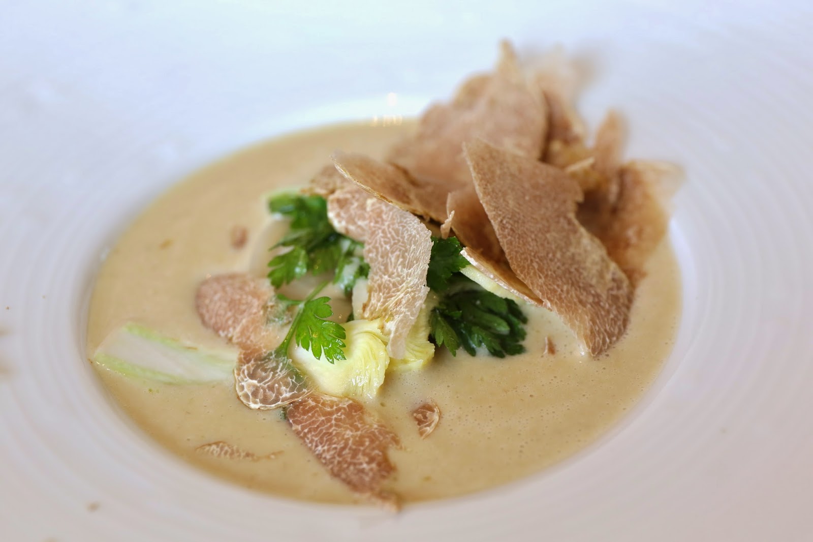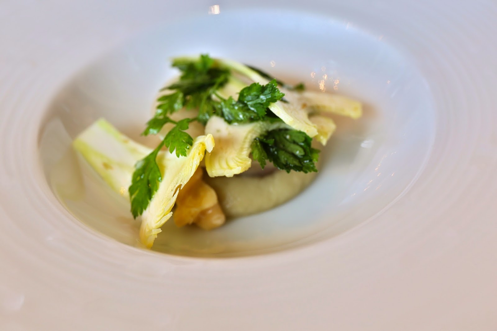 L'artichaut violet, la truffe blanche d'Alba - our second amuse - which was really an appetizer - was a (violet?) artichoke salad and a raviolo with Colonnata pork.