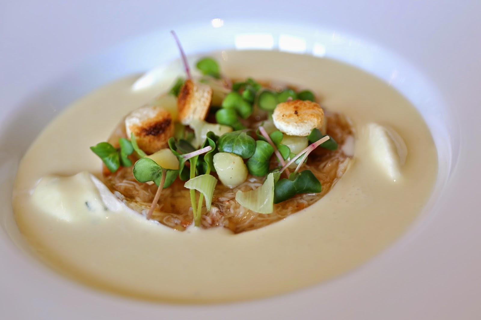French tourteau crab jelly, potato leek salad and Vichysoisse - what a beautiful dish! I always love the flavors that tourteau crabs offer, and here the shredded crab meat is encased in gelée. Since this was surrounded by Vichysoisse - which is something I really love - it was only fitting that it came with a potato and leek salad on top. Very, very delish. The quenelles of tarragon cream coated the inside of one's mouth with a lovely fragrance, naturally...