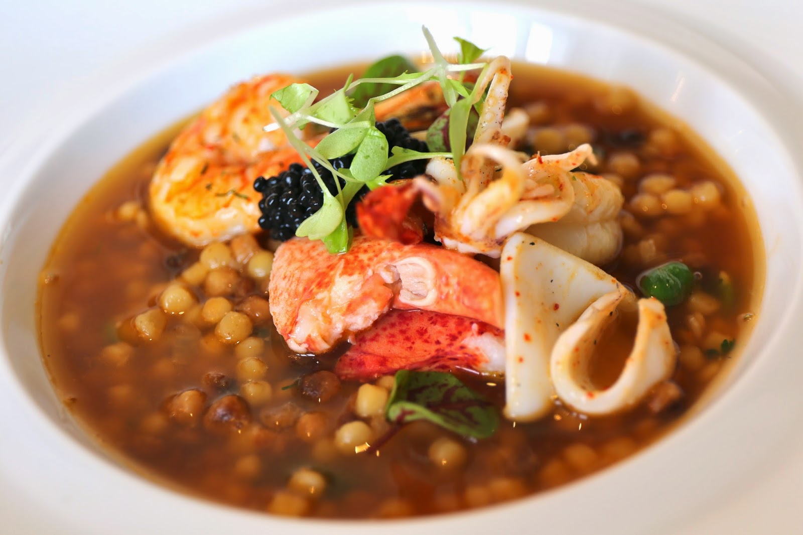 Canadian lobster, king prawns, squid, fregola sarda in a shellfish bouillon and Avruga - OK, so I did it again... I'm a stupid, salivating Pavlov's dog. The words "fregola" appeared before my eyes and I ignored every other dish on the menu.