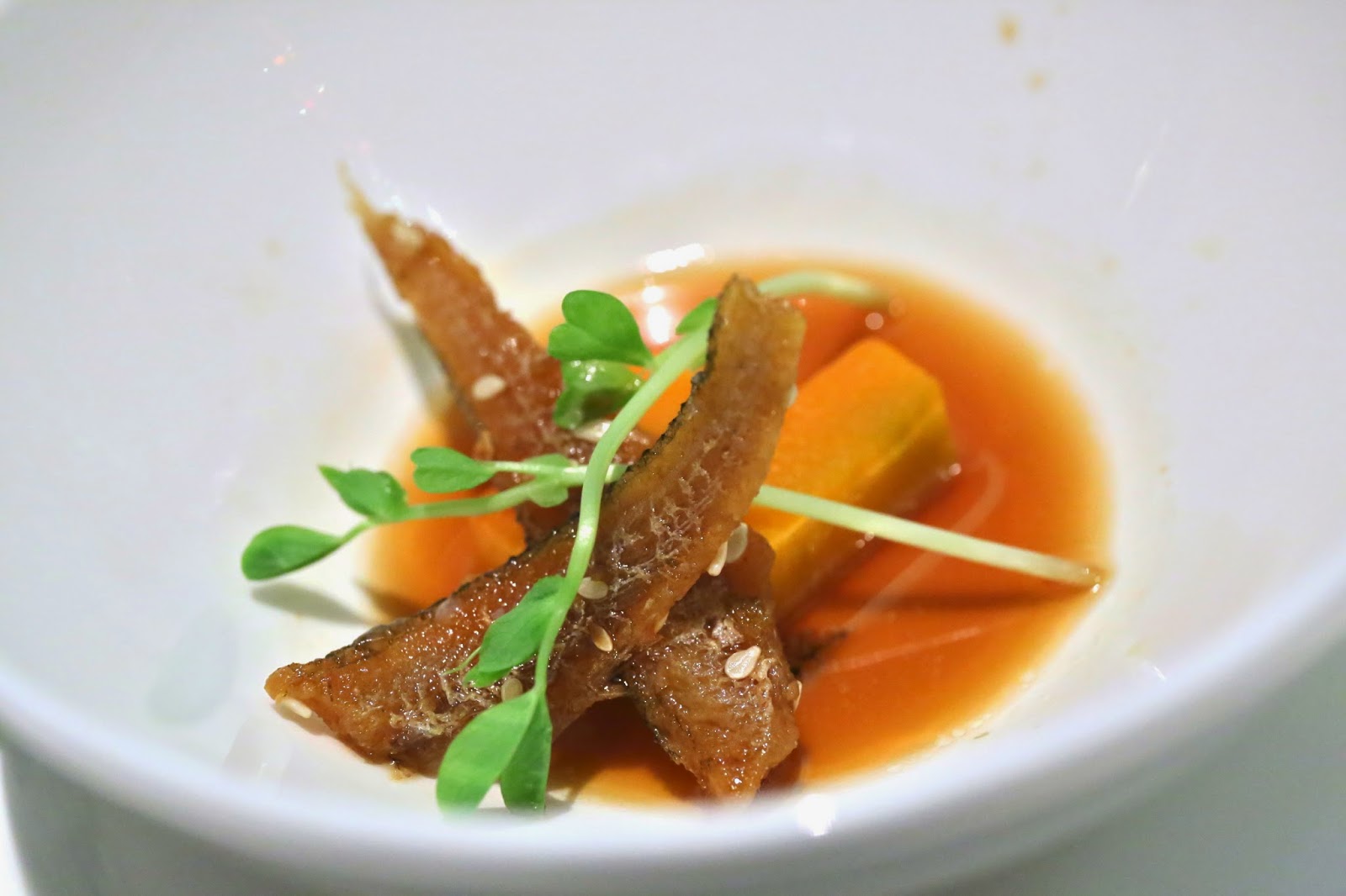 Our amuse bouche came in a little bowl, and contained deep-fried anchovies with pumpkin in black vinegar. The fish tasted very familiar, and I found that they were actually Osbeck's grenadier anchovy (鳳尾魚) - little fishies that I grew up eating out of tins.