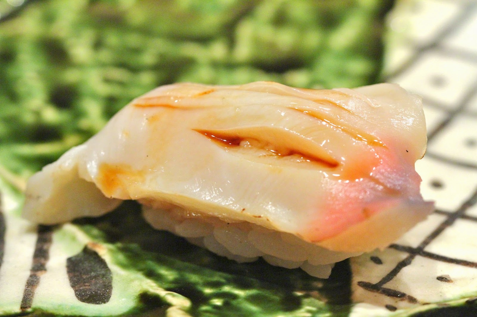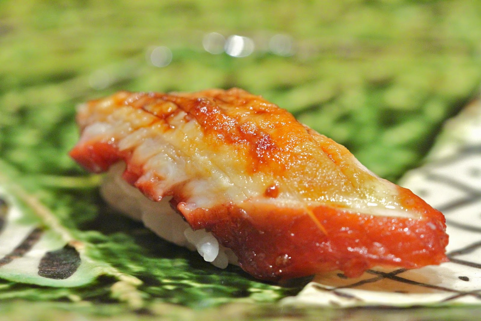 Mackerel (鯖) - I love it when they use these wafer-thin slices of kelp on top of the neta (ネタ)... Mackerel is one of my favorite kinds of fish, both for the flavors as well as texture. While I expected the smoky flavors here, I was surprised at the sweetness that probably came from the tare (タレ) or the kelp marinade...