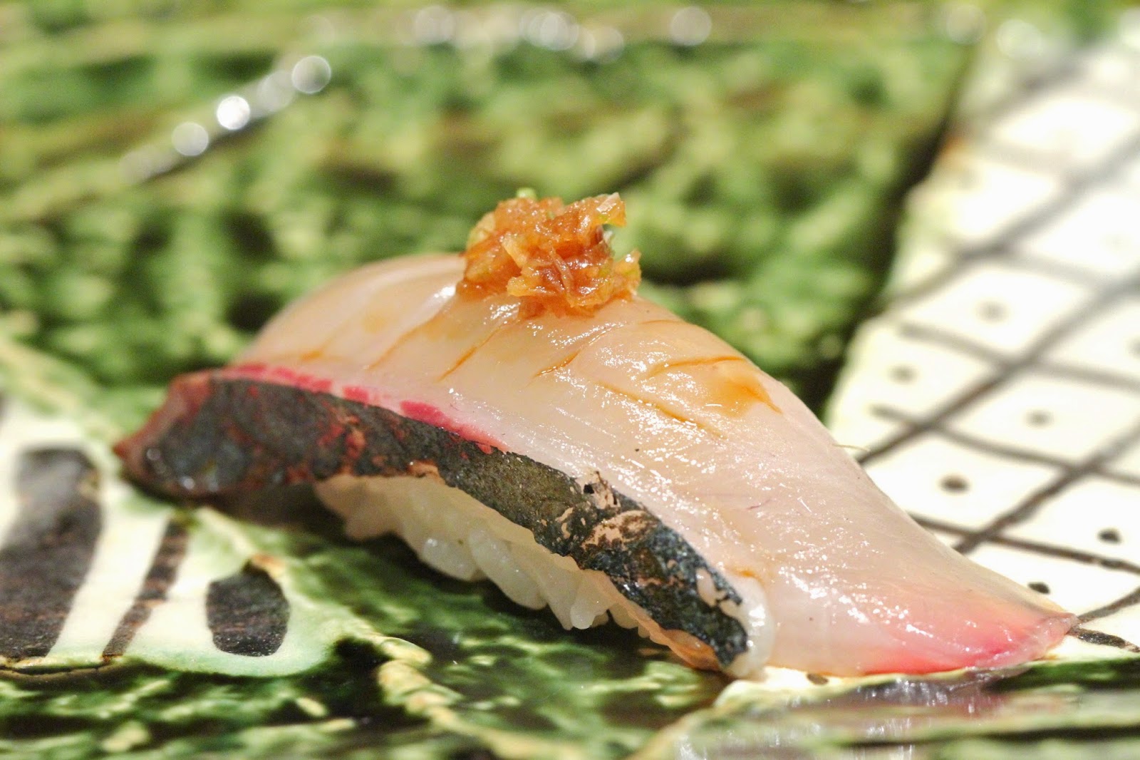 Yellowtail (鰤) - wild, and surprisingly not crunchy at all as I had expected during this season. Nice smoky flavors from the skin.