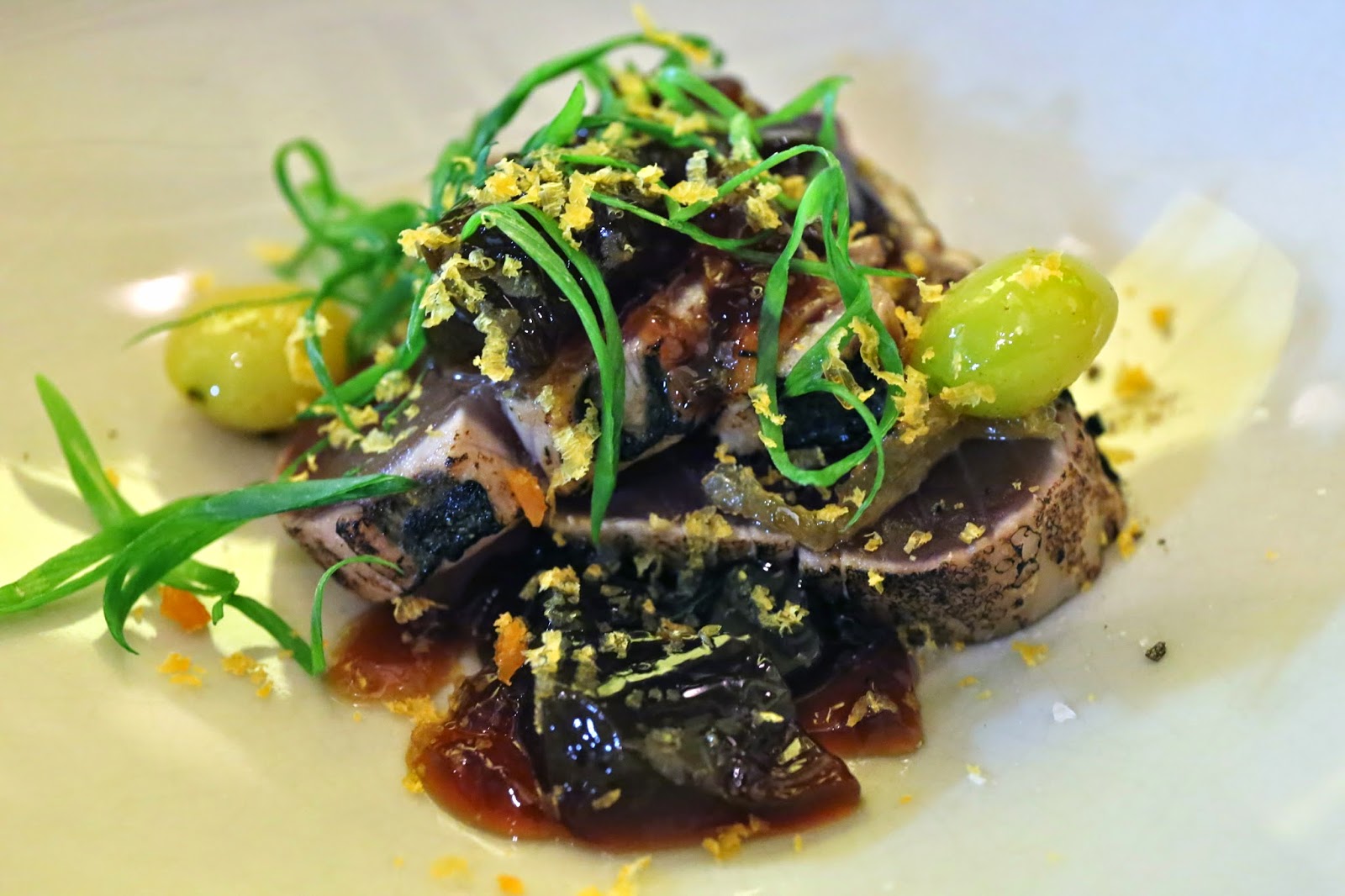 Red mullet with bellota soup - this was absolutely beautiful. The red mullet was tender and melt-in-your-mouth. There was a good contrast between the slightly strong flavors coming from the cockles and those coming from the bellota ham - both in the broth and the crispy chunks. Interesting to find a slice of kumquat, but even more interesting that I should find a thin slice of lardo. The tiny little tomatoes were nice, too. But the one fail here? The cockles were full of sand. If there's one thing I REALLY hate, it's sandy bivalves.