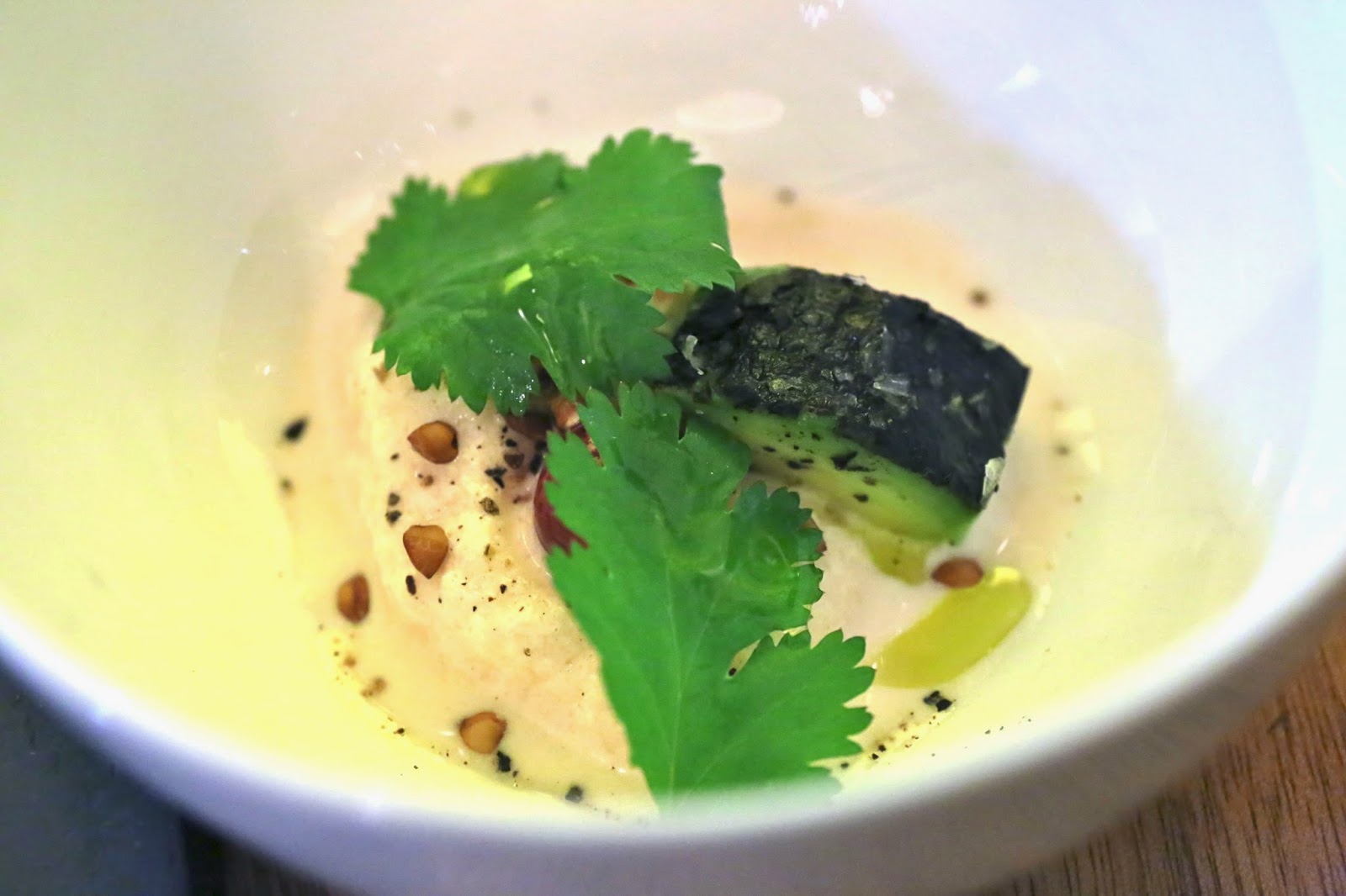 Our amuse bouche came in two parts: first was coconut ceviche with avocado. I'm not sure how one makes a ceviche out of coconut, but this was basically a blob of coconut sorbet with plenty of acidity, topped with a sprinkle of crispy rice, sesame and coriander.