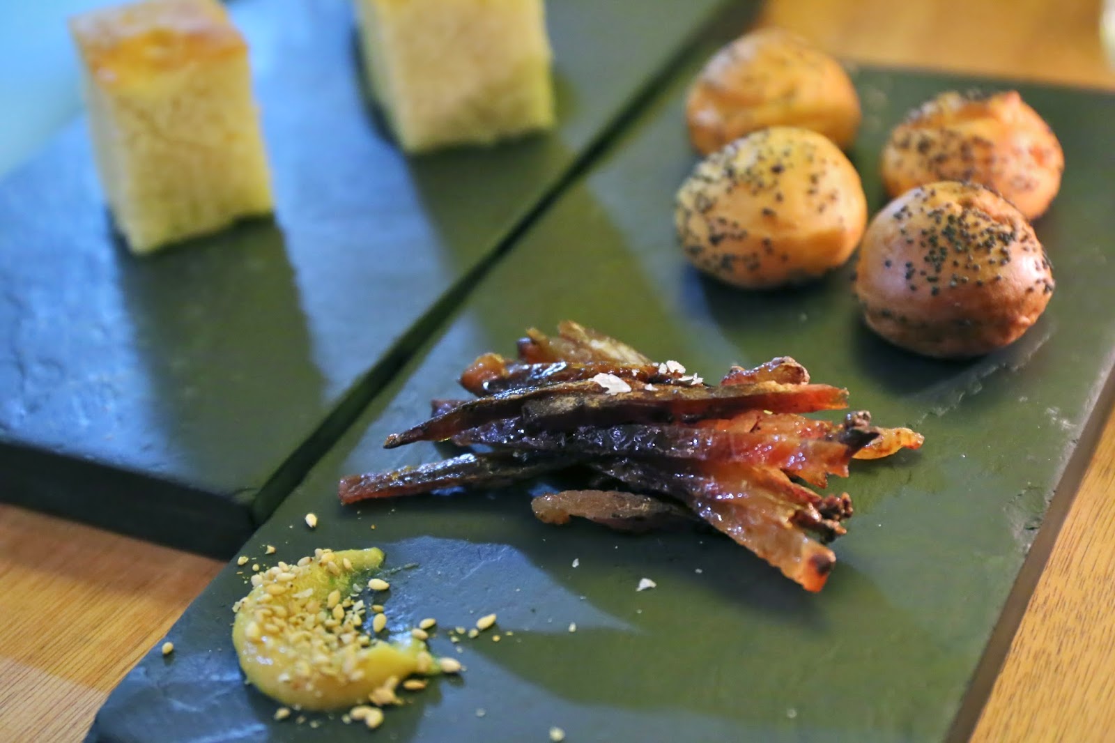 First the nibbles came. Focaccia that I dipped into some nice olive oil. Gougères made with Cantal and poppy seeds. Dried fugu skin, undoubtedly marinated with mirin (味醂). But the best part was the little bit of wasabi-flavored miso... which had such a wonderful kick on top of both sweet and savory flavors.