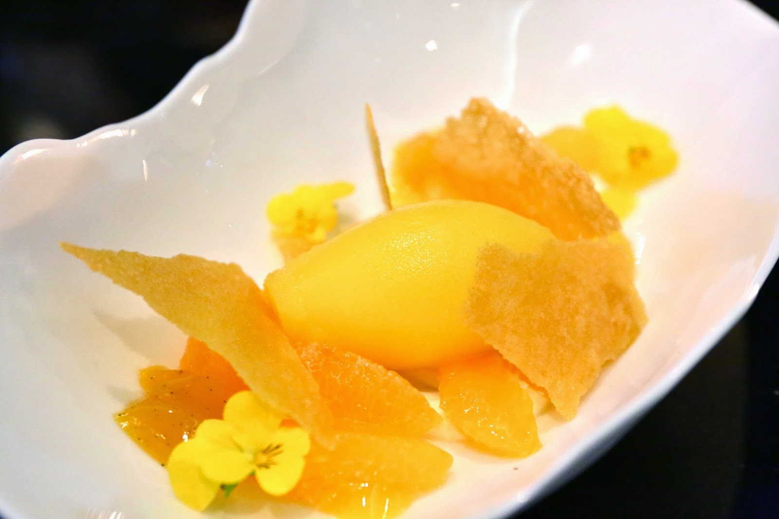 Fresh mandarin, sorbet and tuile biscuit - a wonderfully refreshing dessert. I've always had a soft spot for mandarin oranges, and this was just perfect.