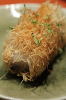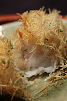 "Amadai" tilefish wrapped on kadaif with aroma of binchotan, salad of five green colors - interesting to see kadaif here, as this has just shown up at my Robuchon dinner last month… So the kadaif is made into a shell around the amadai (甘鯛), and sprinkled with grated yuzu (柚子) rind. Definitely smelled the aroma of the binchotan (備長炭).