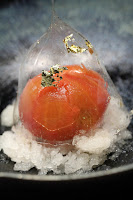 Fruit tomato poached with "Umeshu" encased in a fragile glass - there was the candied "glass dome" on top with the seemingly obligatory gold foil… The little tomato from Shizuoka (静岡) was delicious, especially with the umeshu (梅酒) flavors. The lime sorbet underneath worked well.