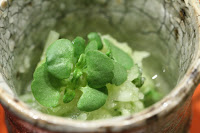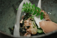 Quickly simmered "Iidako" octopus and refreshing wasabi cucumber salad - the little octopus (飯蛸) was really, really tender… and served with seaweed (海苔), Japanese spikenard (独活), and sansho leaf (木の芽).