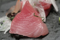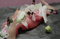 Sashimi of "Yokowa" baby tuna, spring onions with fragrance of shiso leaf and lime - I have been staying away from bluefin tuna as much as possible for a while, but every once in a while I will break my habit when there is something truly special… and tonight there definitely was… The baby Pacific bluefin tuna (黒鮪) is finished this season when it is under 10kg…