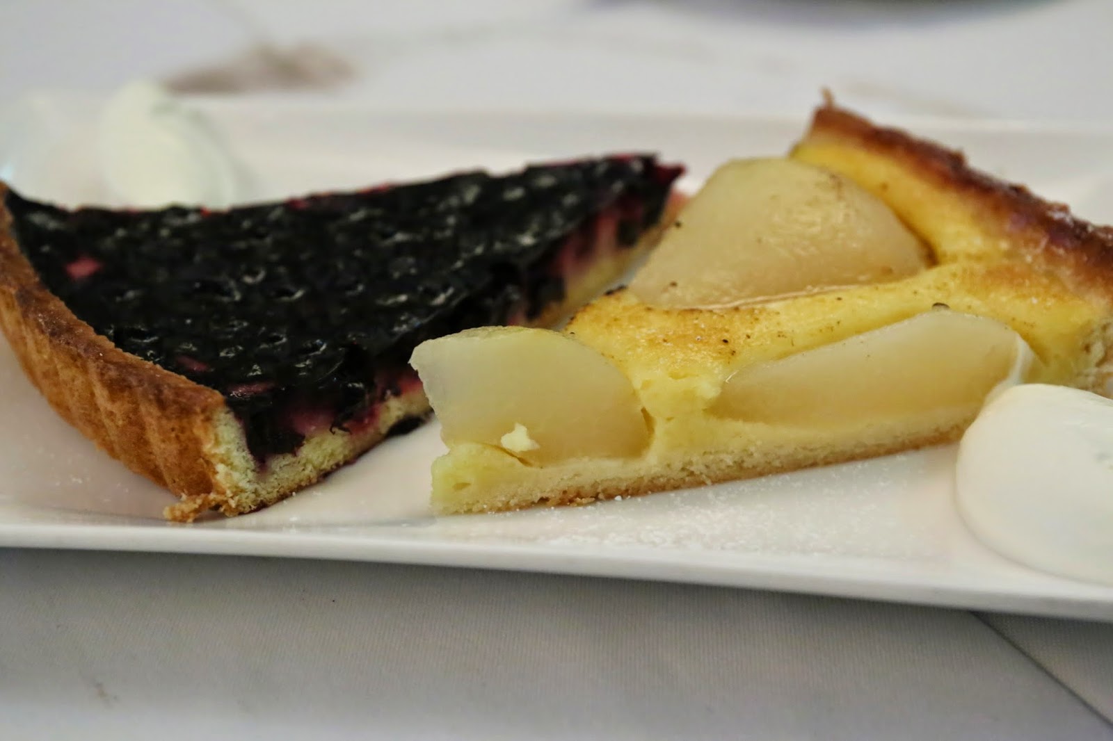 We would have been happy to stop here, but the kitchen sent out a slice of tarte bourdaloue along with a slice of blueberry tart. So we nibbled on these. Yum.