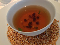 Mushroom: organic, custard, pearl barley, chicken, consommé - there was a layer of mushroom custard at the bottom of the bowl, with a bunch of little shrooms "sprouting" out of it. I found the custard to be rather over-seasoned, but fortunately the delicious consommé was light and delicate, and provided a welcome relief. Lovely fragrance of the undergrowth, though…