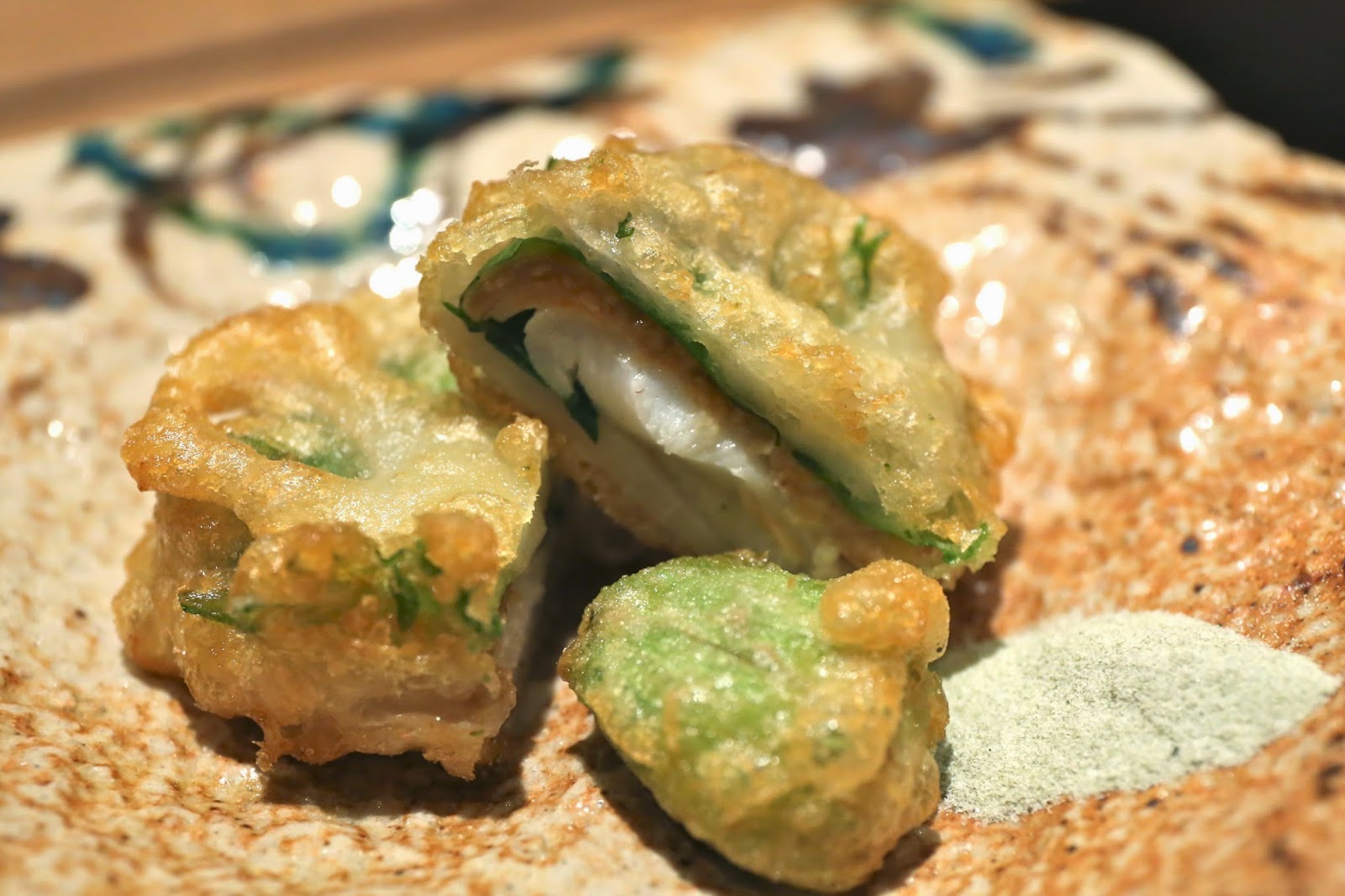 Deep-fried: horsehead snapper, monkfish liver and oba herb, lotus root, butterbur bud (揚物:甘鯛と鮟肝の蓮根挟み揚げ) - deep-fried “sandwich” with layered flavors from premium ingredients like amadai (甘鯛) and monkfish liver - both of which are beautiful and tender. A wrapping of perilla leaves (大葉) provides additional fragrance. There was also a deep-fried butterbur bud (蕗の薹) with its mild bitter flavors, signifying that Spring is approaching.